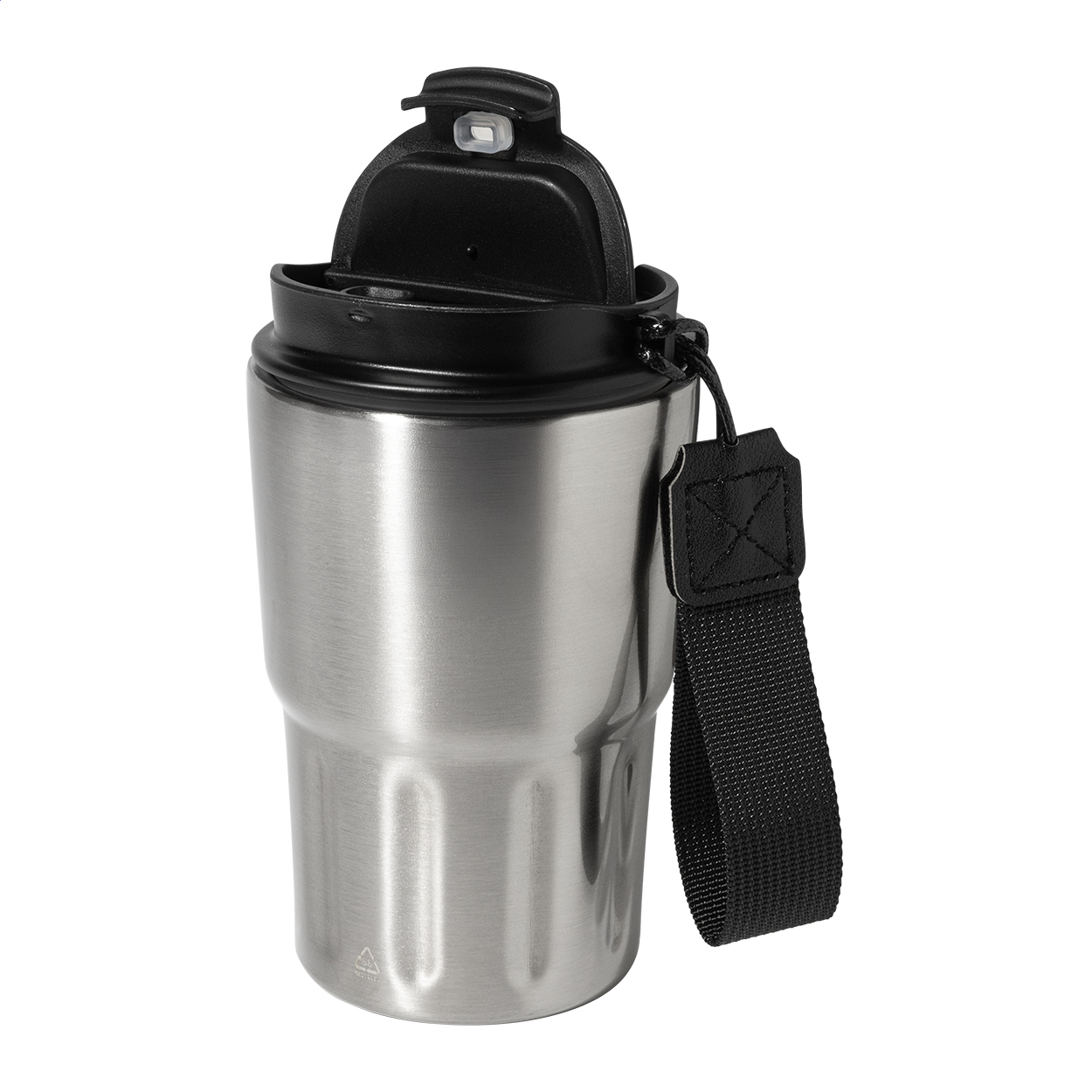 Dvoustěnný termo hrnek z recyklované nerezové oceli s izolačním víčkem z PP. S poutkem z RPET polyesteru. 350 ml.