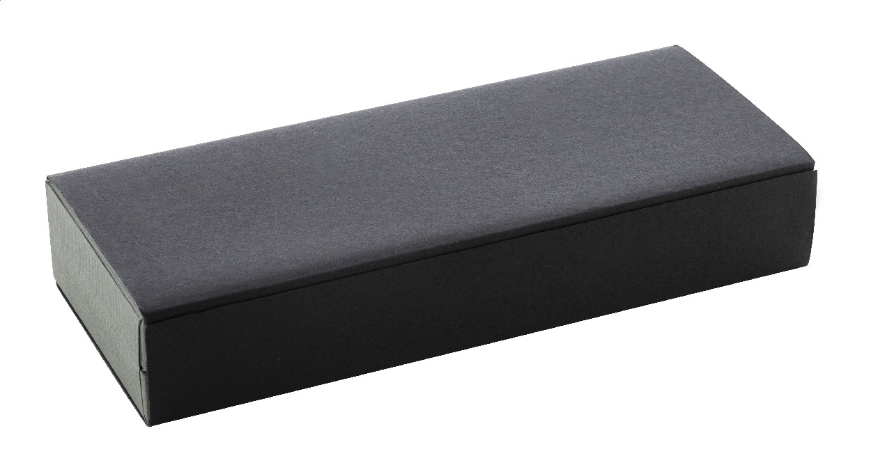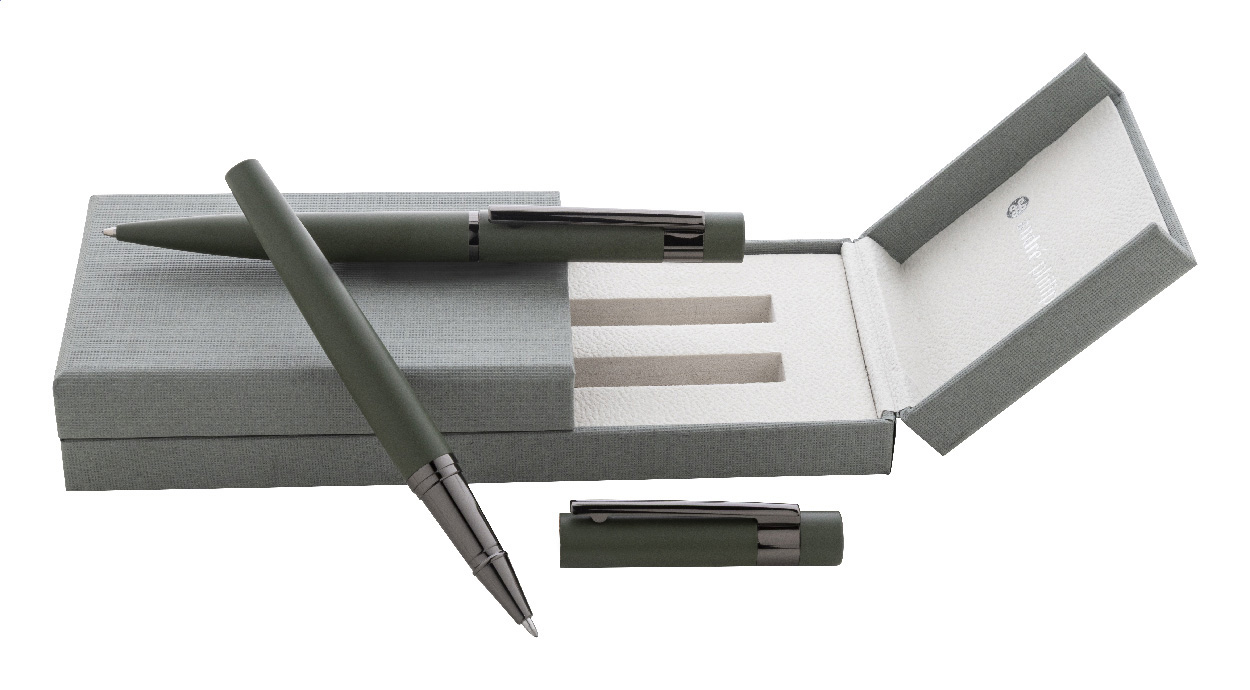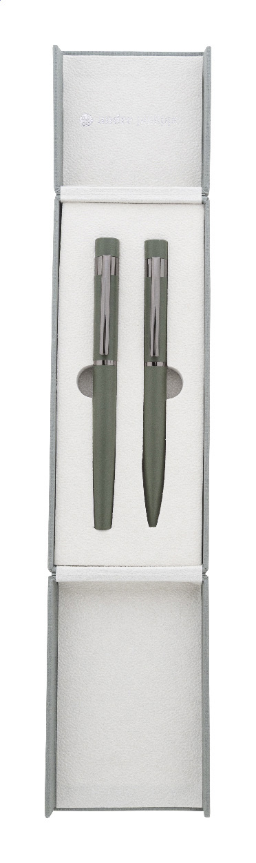 Elegantní sada kovového kuličkového pera a rolleru s lesklými detaily v barvě antracit. V barevně sladěné dárkové krabičce a s modrou náplní. Produkt značky André Philippe.