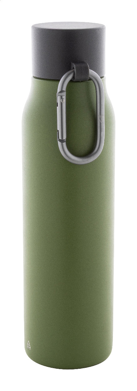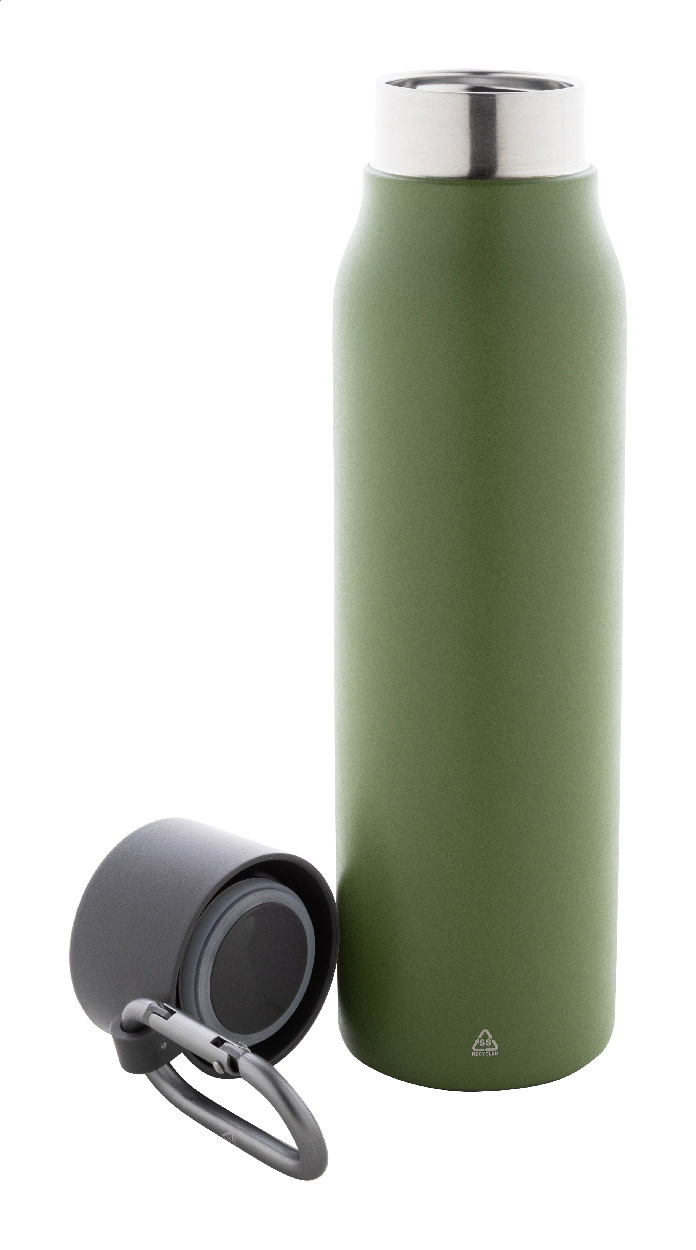 Dvoustěnná vakuová láhev z recyklované nerezové oceli s víčkem z PP a karabinou z recyklovaného hliníku. 500 ml.