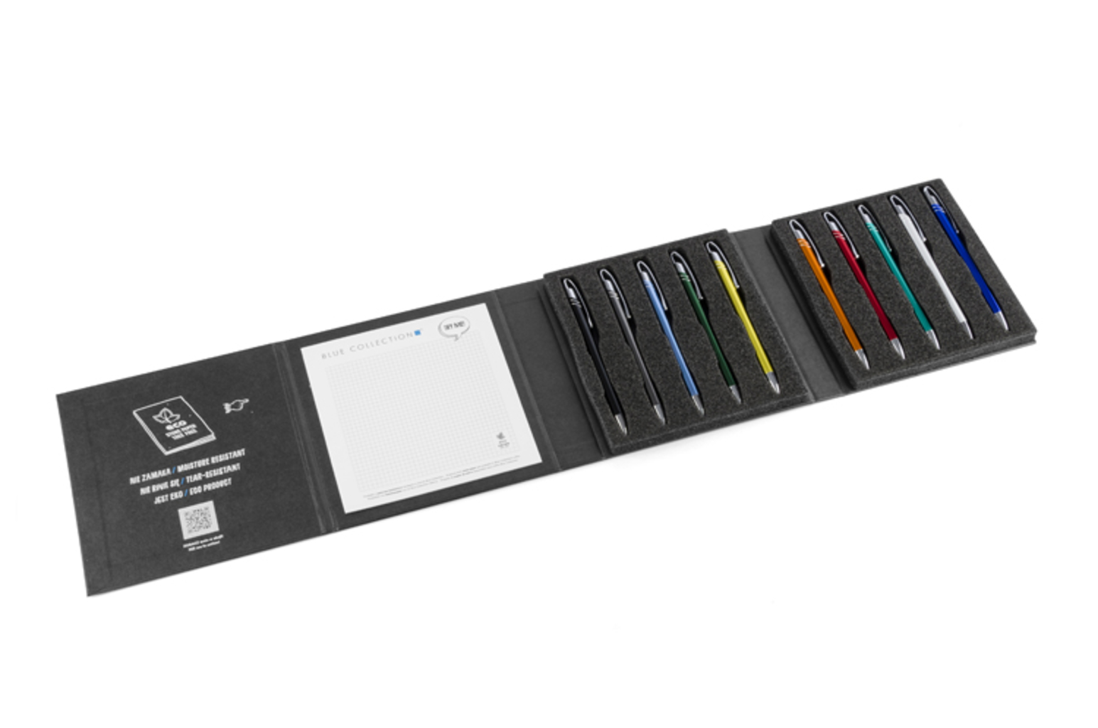 Moderní a stylové pouzdro obsahující 10 nejpopulárnějších kovových per od Blue Collection nabídky. Dobře vyrobené bude imponovat každému, kdo je drží. Bude to ideální nástroj pro prezentaci, díky vloženému notepadu z kamenného papíru, který umožní vyzkoušet pera.