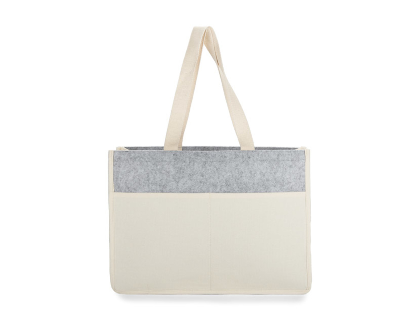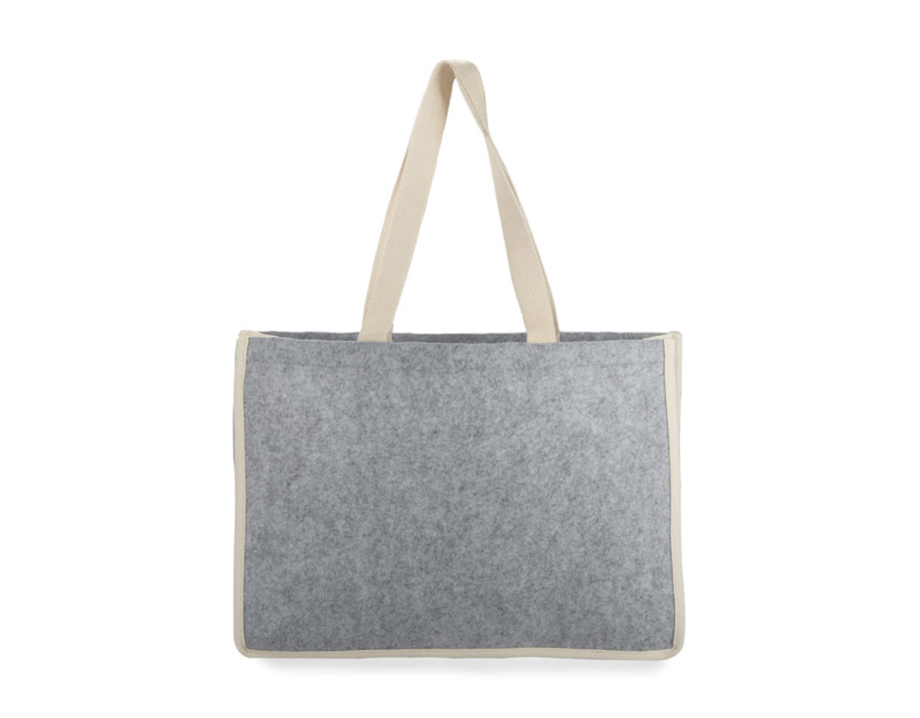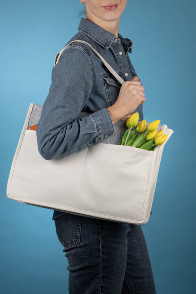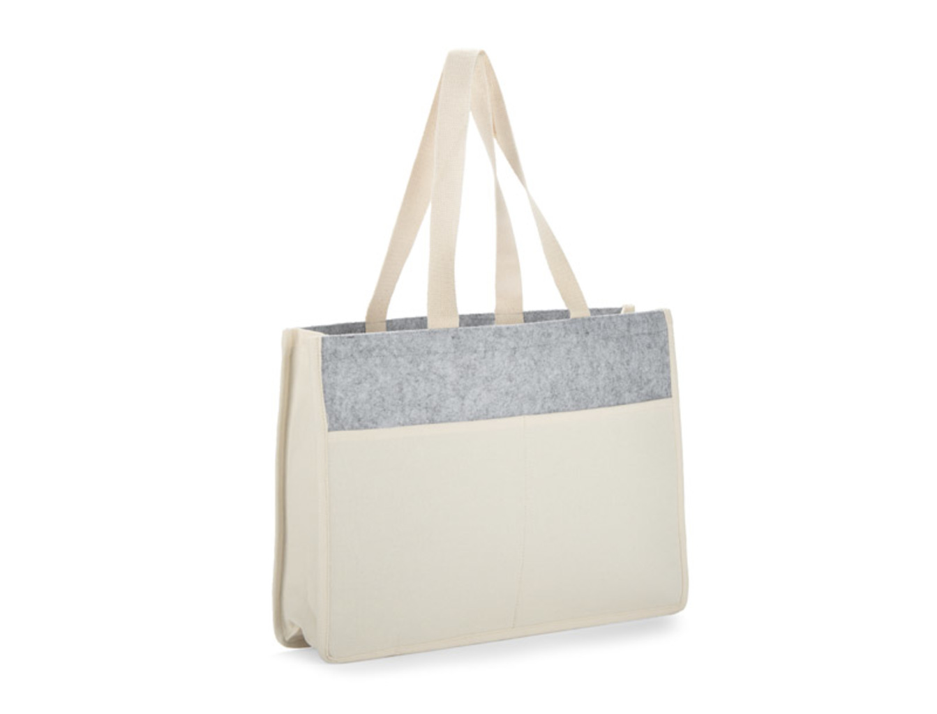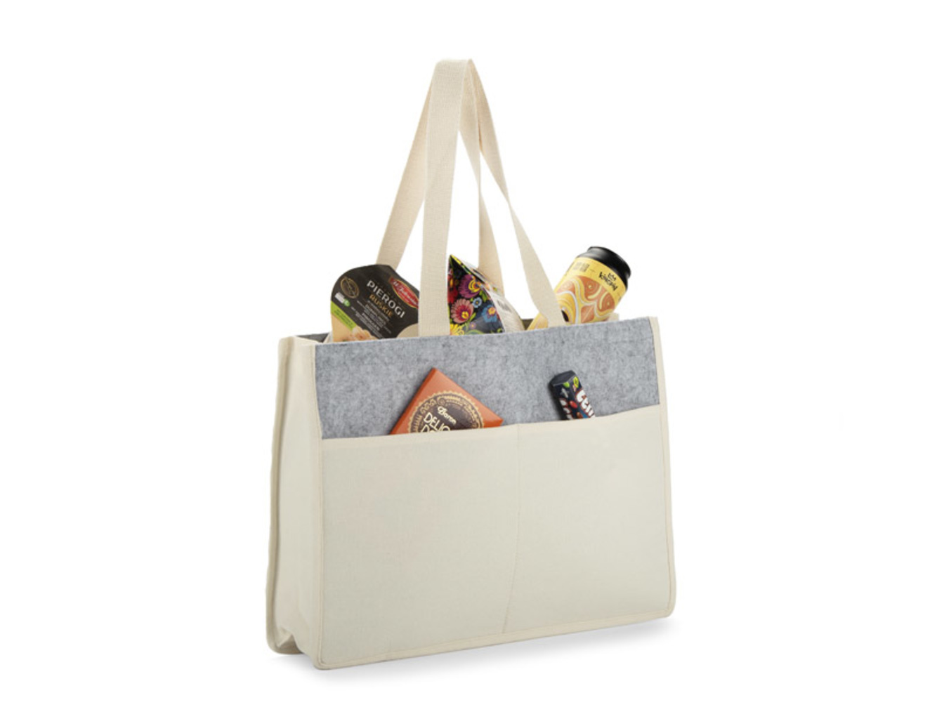 Bavlněná taška PAJ o hmotnosti 320 g kombinuje dva materiály - přední a zadní strana je vyrobena z plsti, zatímco dno, boky, ucha a dvě přední kapsy jsou z bavlny. Má dlouhé uši, které umožňují pohodlné nošení na rameni. Otevřená konstrukce umožňuje rychlý přístup k obsahu. Dobře poslouží jako nákupní taška i jako taška na pláž nebo na procházku. Možnost označení značkou z ní dělá praktickou reklamní pomůcku.