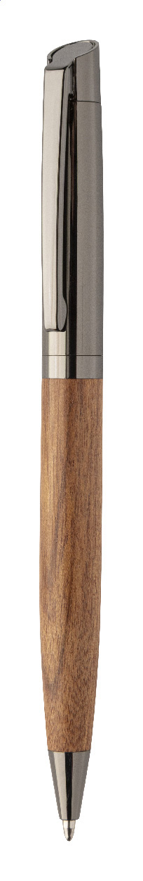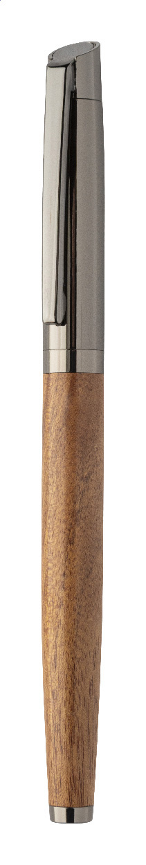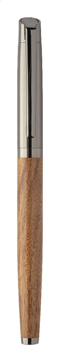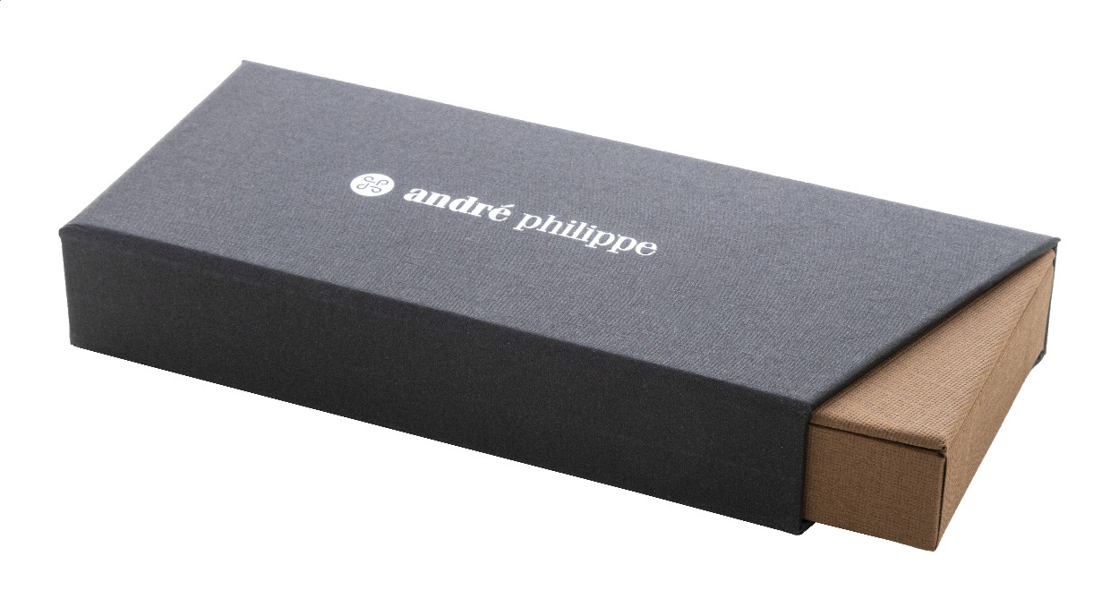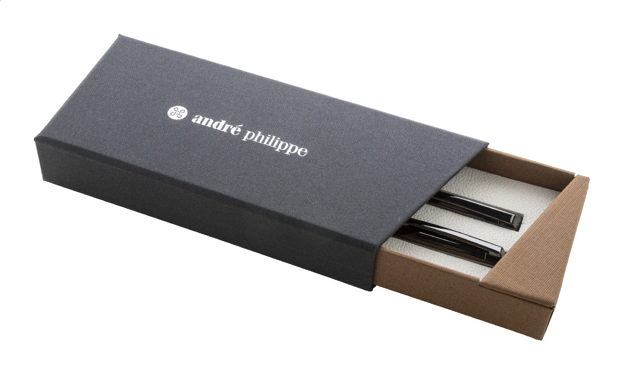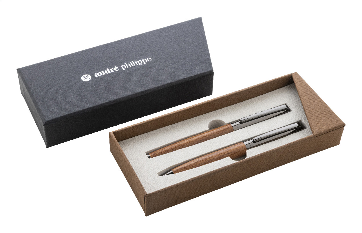 Elegantní sada kovového kuličkového pera a rolleru s dřevěným tělem a lesklými detaily v barvě antracit. Ve dvoubarevné dárkové krabičce s modrou náplní. Produkt značky André Philippe.