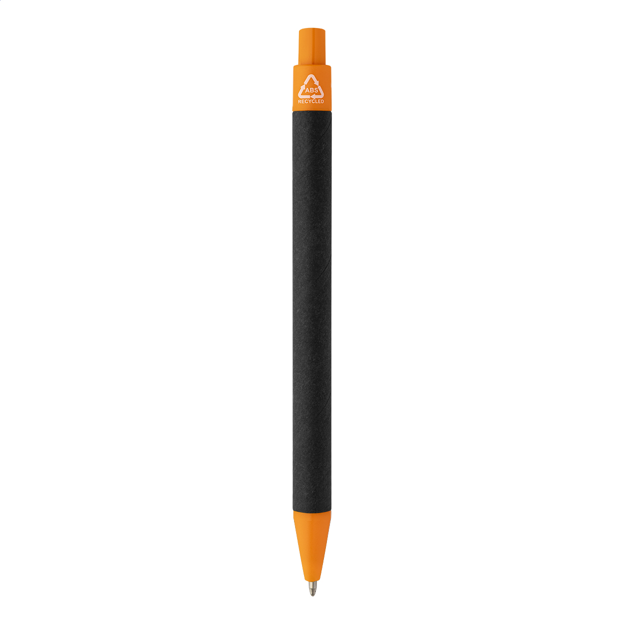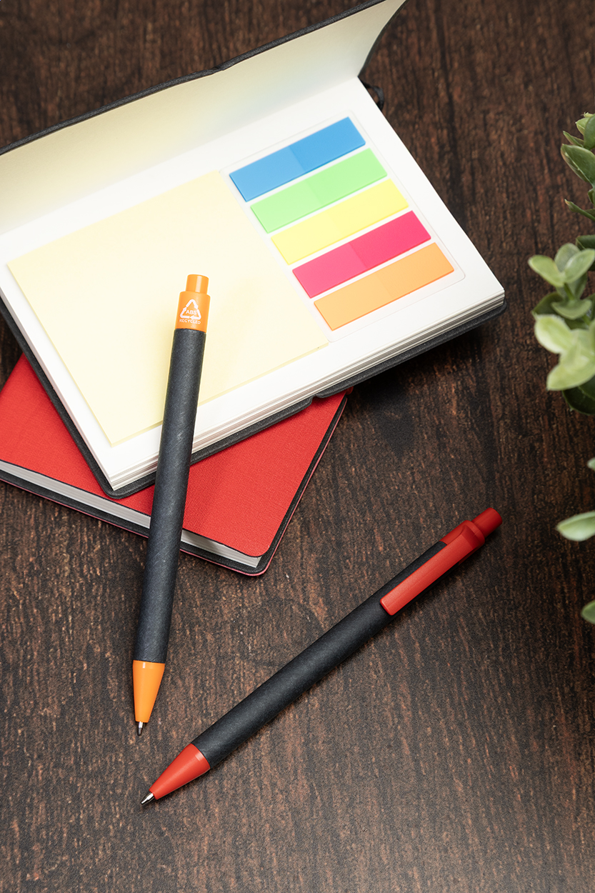 Kuličkové pero z recyklovaného papíru s černým tělem a recyklovanými ABS díly. S modrou náplní.
