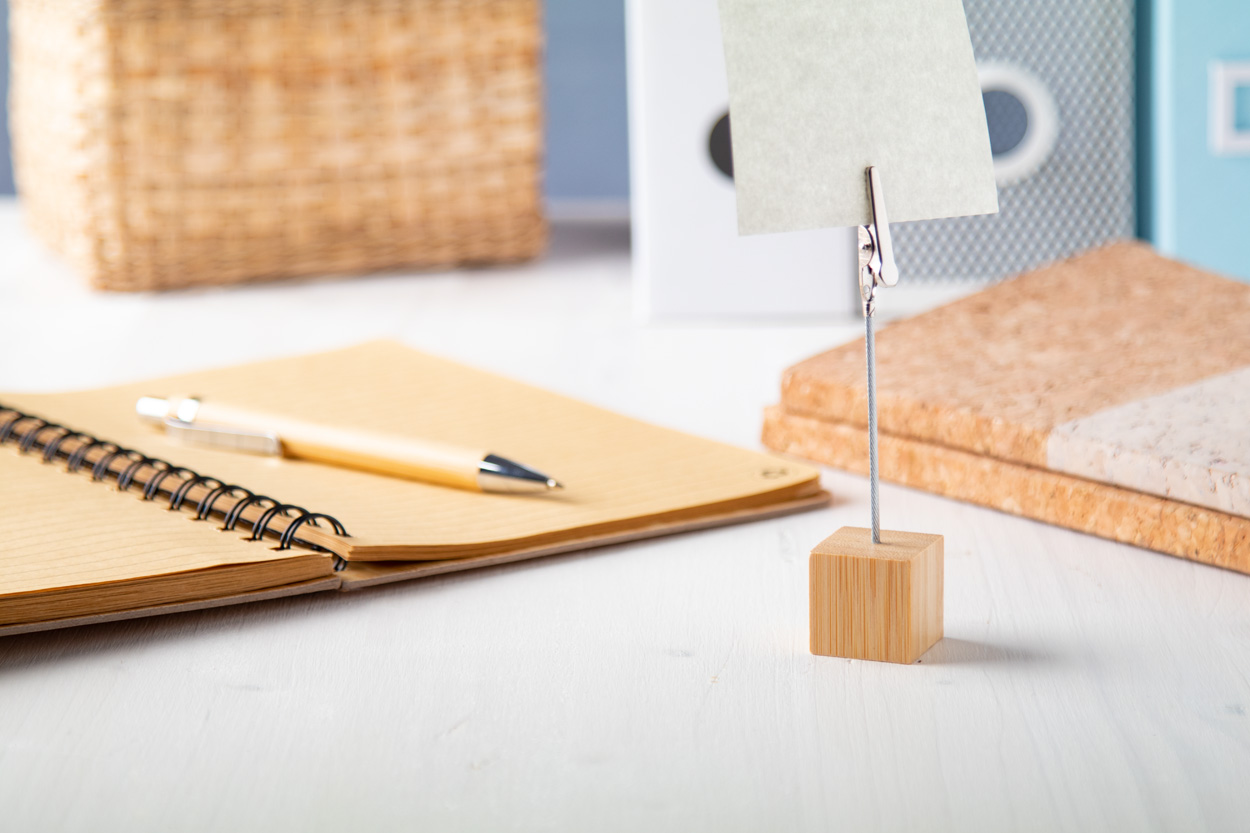 Bambusový stojánek s kovovým klipem.