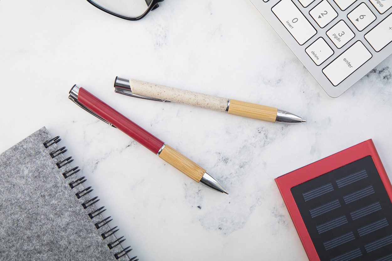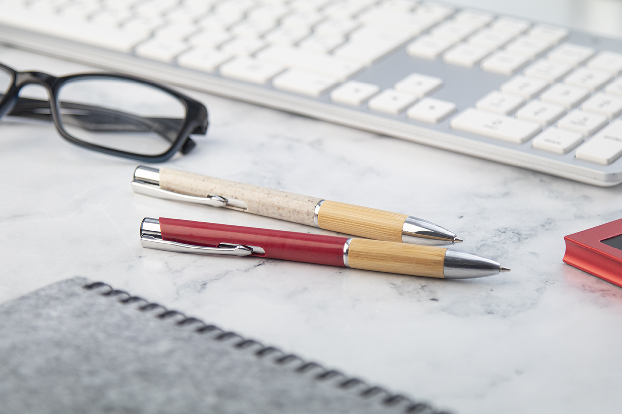 Ekologické plastové kuličkové pero z pšeničné slámy s bambusovým úchopem a kovovými částmi. S modrou náplní.