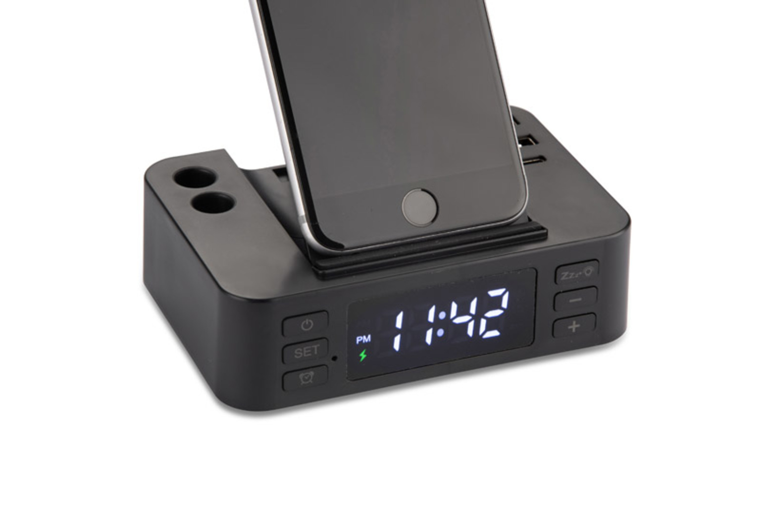 CLOCKI budík s indukční nabíječkou je praktický reklamní dárek, který se hodí na stůl nebo noční stolek. Má tři USB porty (USB, USB, USB-C) a bezdrátovou nabíjecí plochu. Telefon lze nabíjet vodorovně nebo vertikálně pomocí skládacího stojanu. Kromě toho budík nabízí dvě přihrádky na pero nebo jiné drobnosti. Sada obsahuje kabel USB-C, což z něj činí kompletní řešení pro každodenní použití.