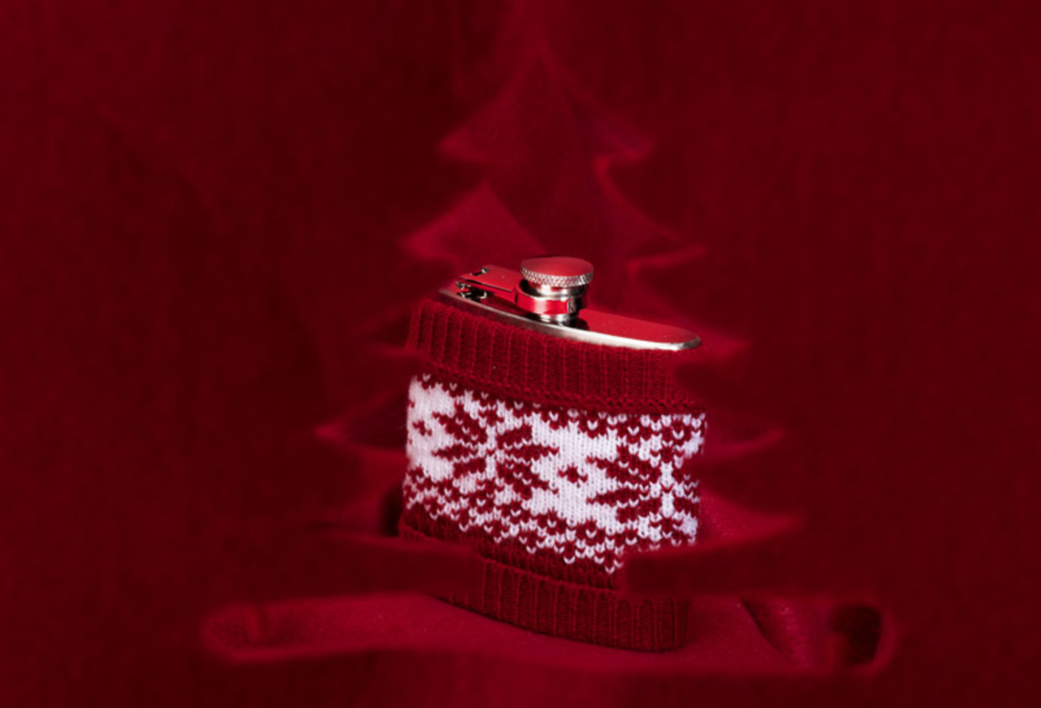 Butylka z nerezové oceli WARM s kapacitou 200 ml a s bezpečnostním uzávěrem. Placatka oblečená do svetru se zimním vzorem. Skvělý nápad na dárek.