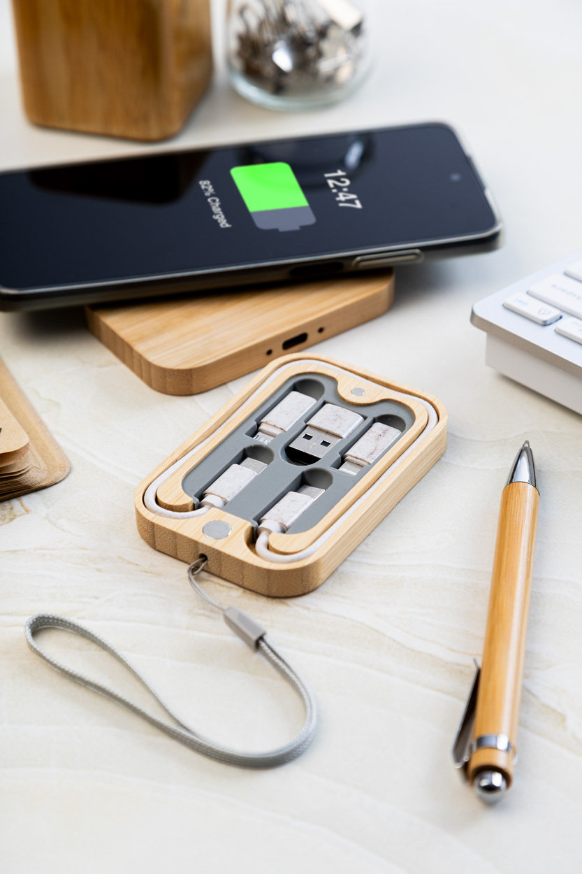 Ekologická sada USB nabíjecího kabelu z pšeničné slámy a bezdrátové rychlonabíječky (15W) v magnetickém bambusovém pouzdře s popruhem. Včetně kabelu USB-C s adaptéry USB, micro USB a Lightning.