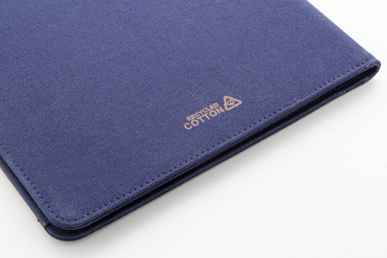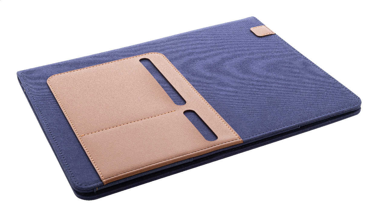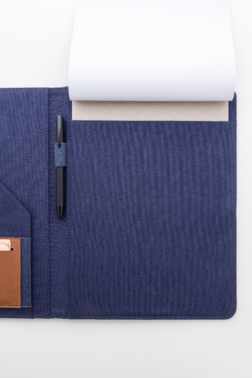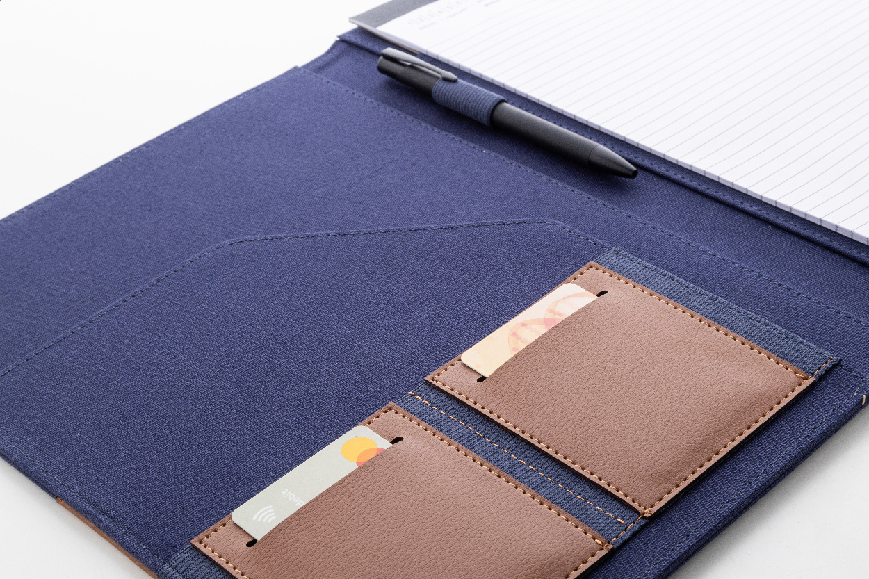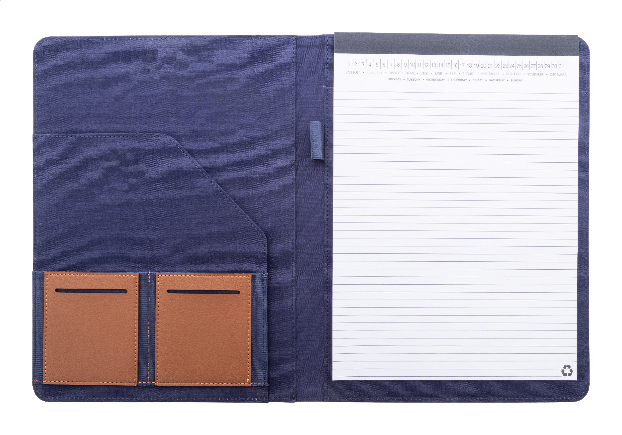 Složka na dokumenty A4 z recyklovaného plátna a recyklované umělé kůže s několika předními a vnitřními kapsami. S blokem na 20 linkovaných listů z recyklovaného papíru. 70 % recyklované bavlny a 30 % RPET polyesteru.