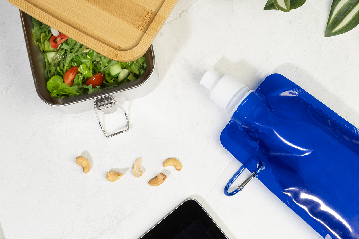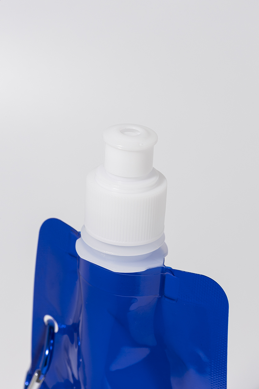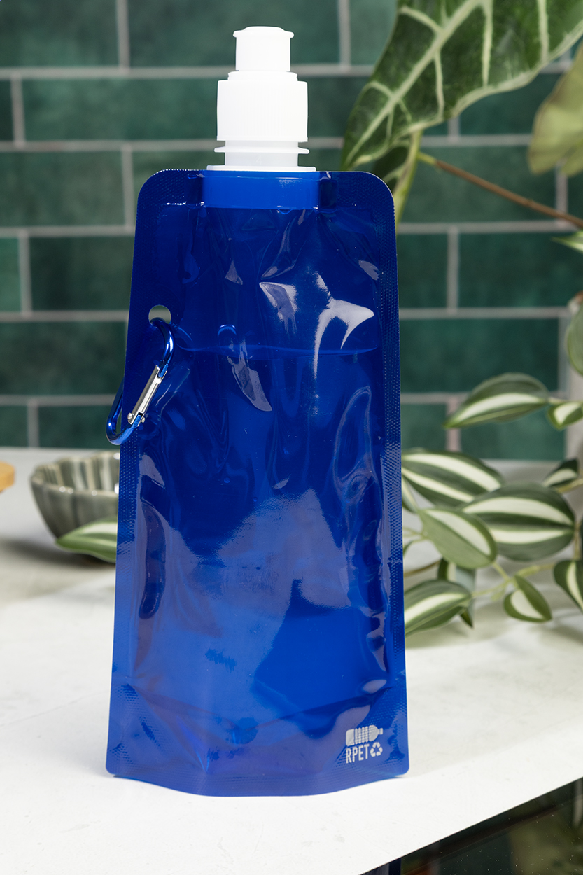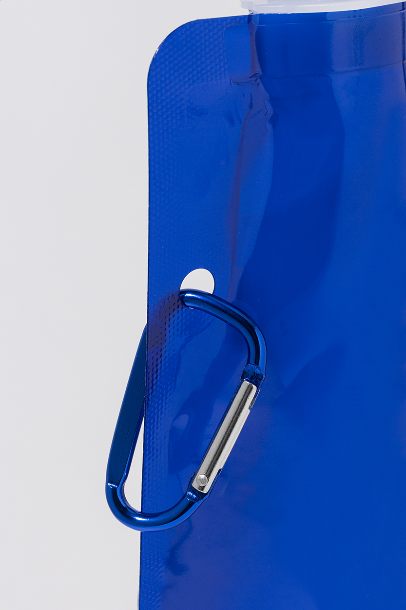 Skládací sportovní láhev z RPET s víčkem na pití a hliníkovou karabinou, 500 ml. Bez BPA. Nevhodná pro sycené nápoje.