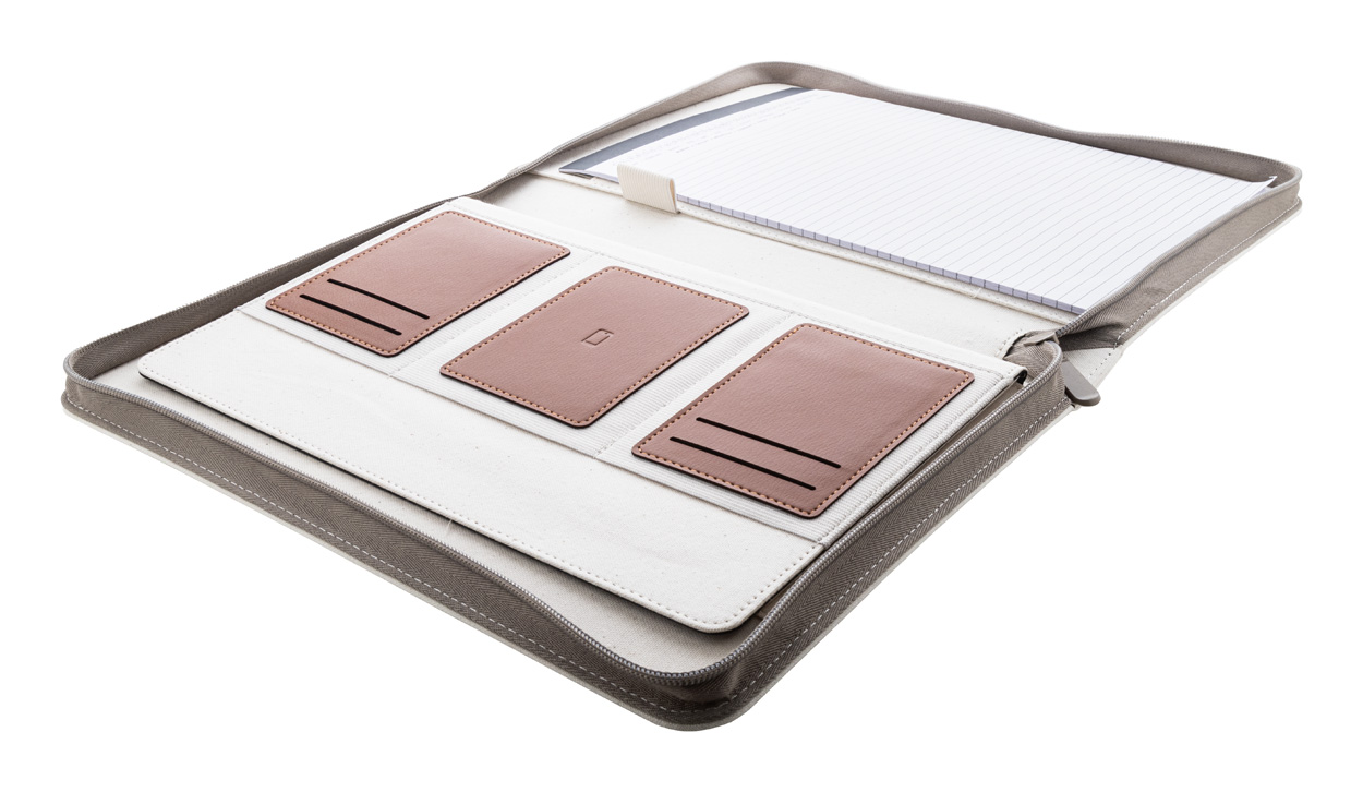 Sloha na dokumenty A4 na zip s uchem z recyklovaného plátna a recyklované PU kůže a s několika vnitřními kapsami s organizérem. S 20 linkovanými listy poznámkového bloku z recyklovaného papíru. 70% recyklovaná bavlna a 30% RPET polyester.
