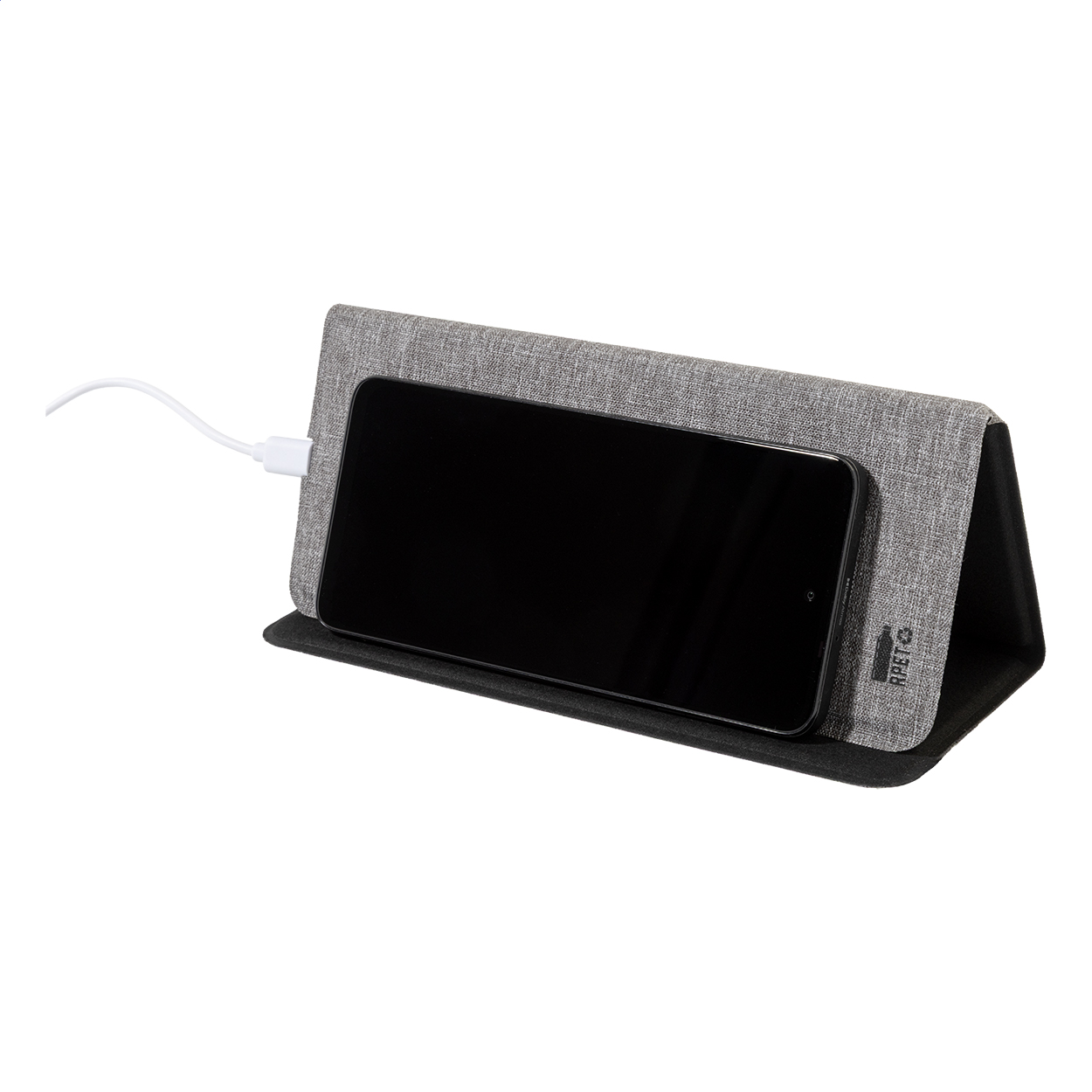 Polyesterová podložka pod myš RPET s vestavěnou bezdrátovou rychlonabíječkou (10W) a funkcí držáku mobilního telefonu. Včetně USB nabíjecího kabelu.