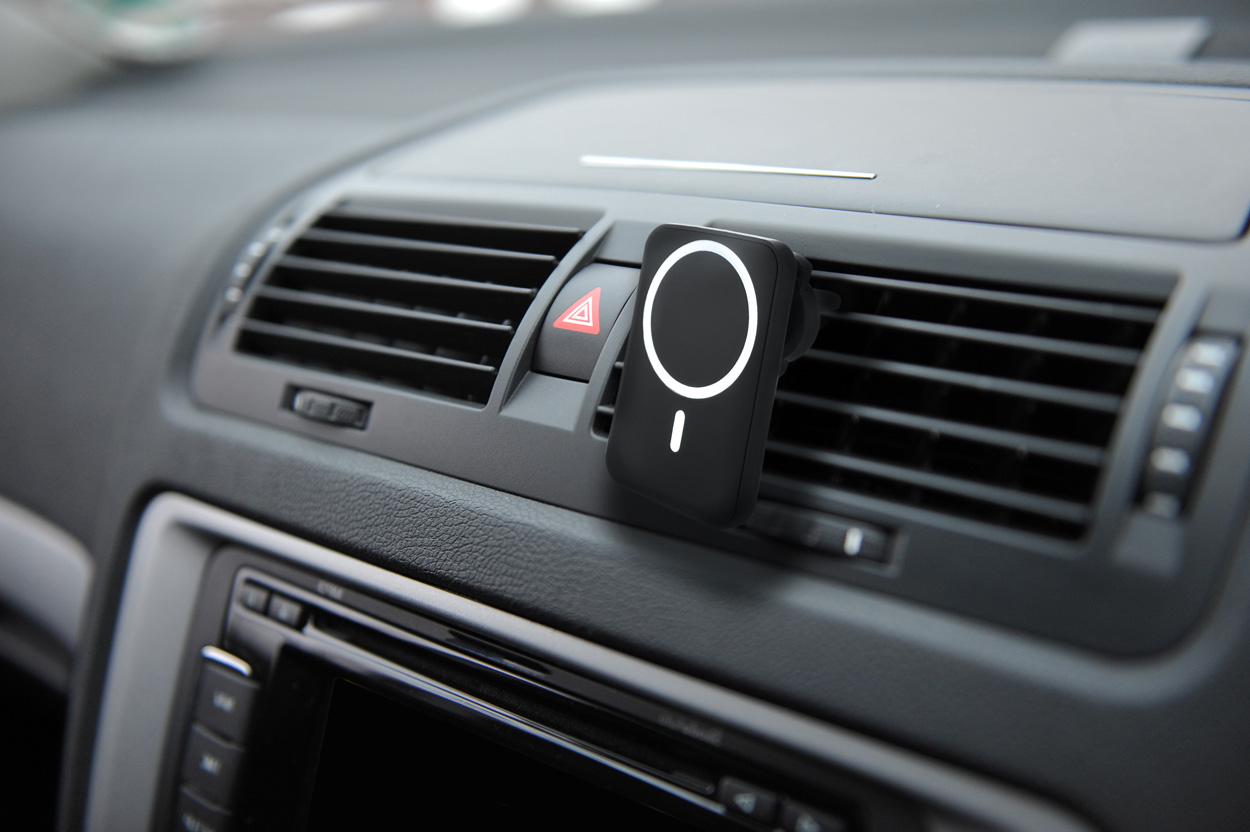 Magnetický držák na mobil do auta v recyklovaném ABS pouzdru s vestavěnou bezdrátovou rychlonabíječkou (15W) a nastavitelným upevněním do větracího otvoru. Včetně samolepícího kovového kroužku pro použití magnetické funkce na jakémkoli bezdrátově nabíjecím zařízení. Kompatibilní s iPhone® 12 nebo novějším. Včetně USB nabíjecího kabelu.