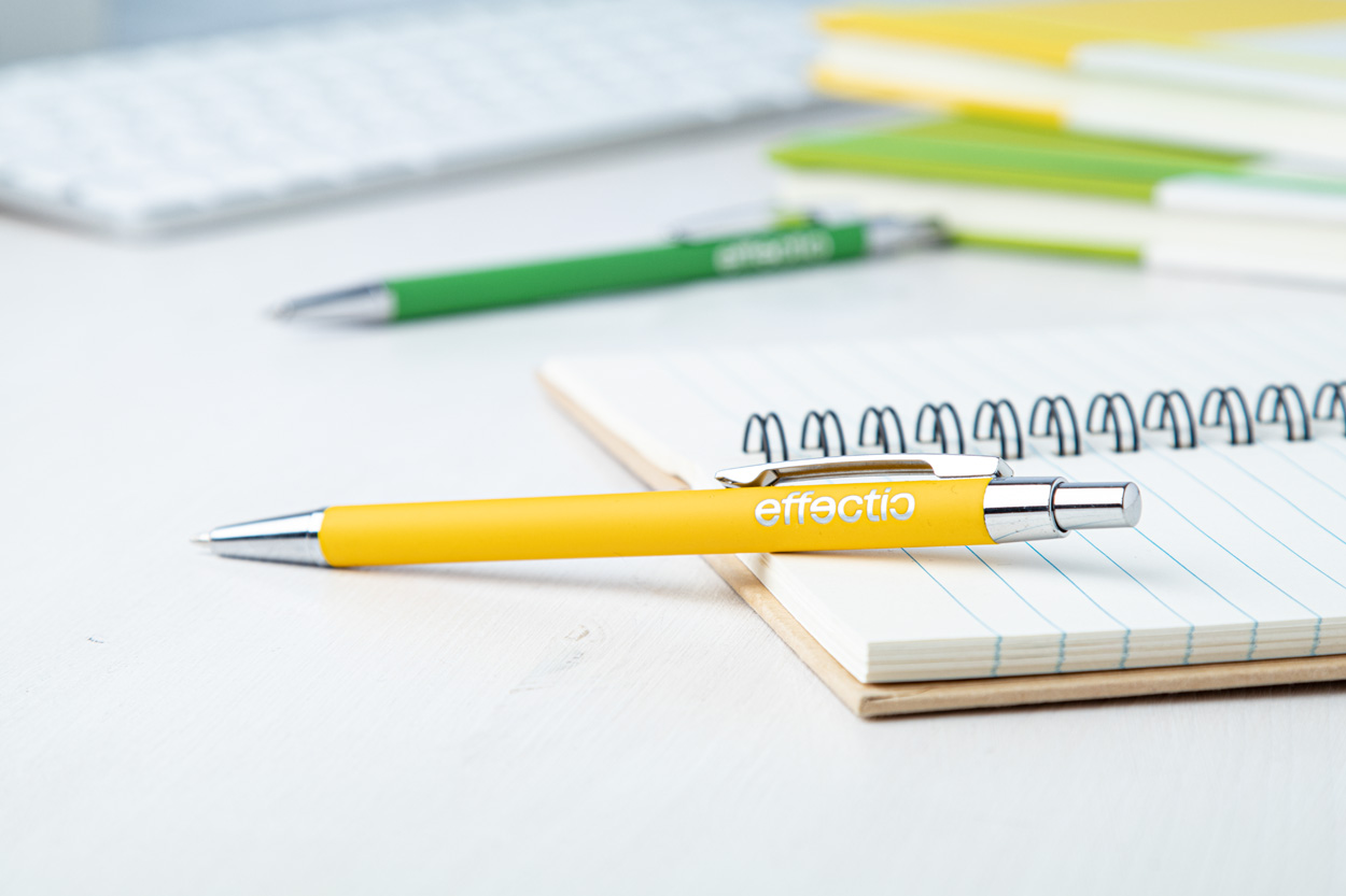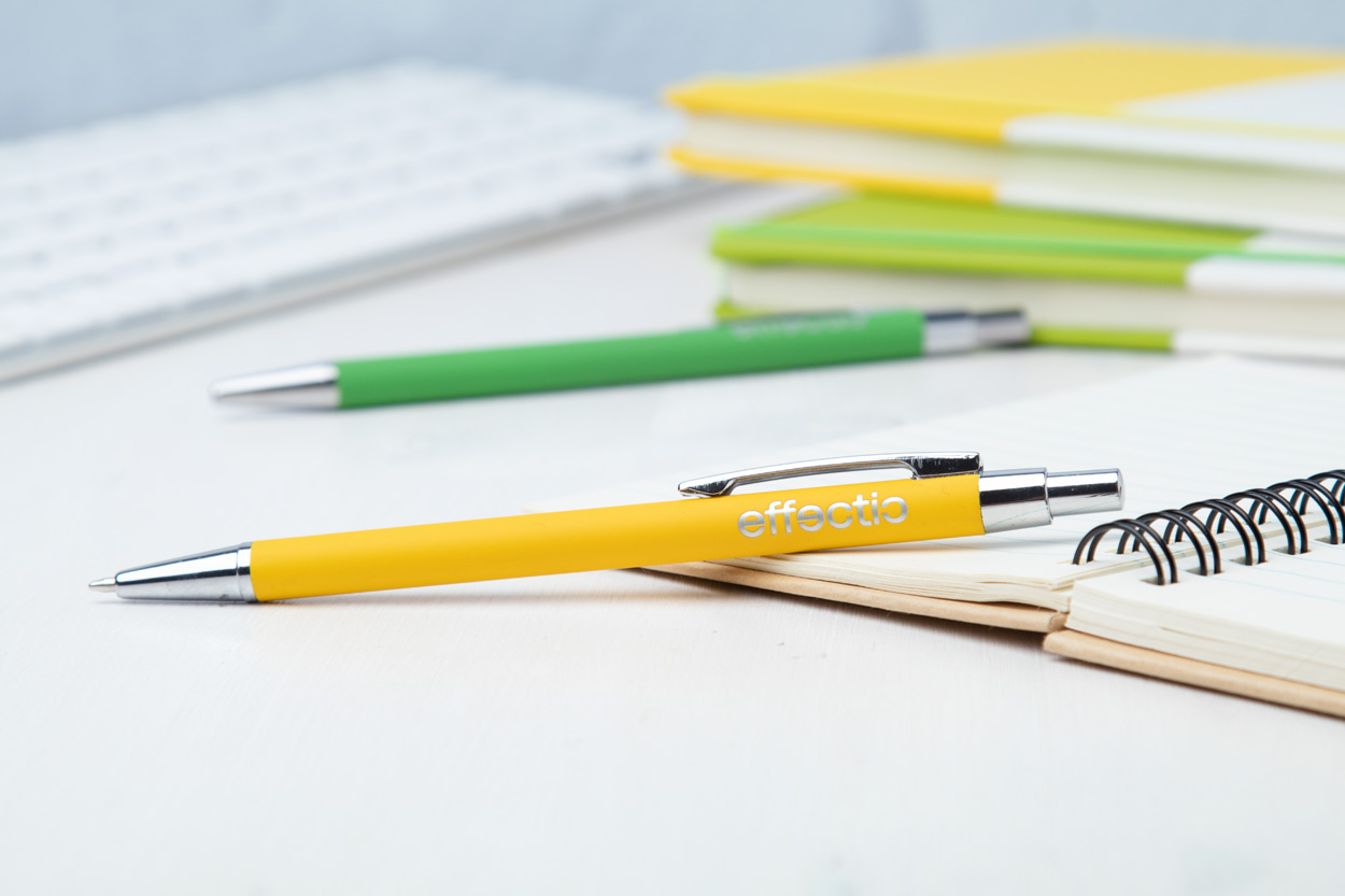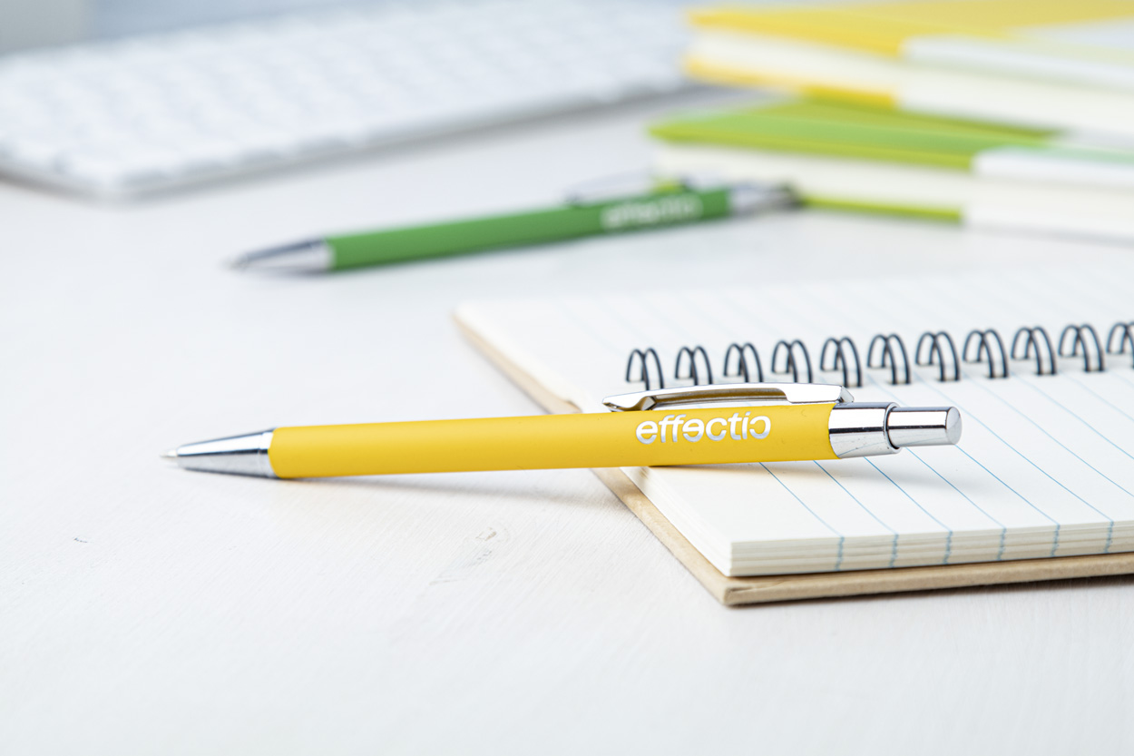 Hliníkové kuličkové pero s pogumovanou úpravou a modrou náplní. Speciální povrch pro zrcadlový laser.