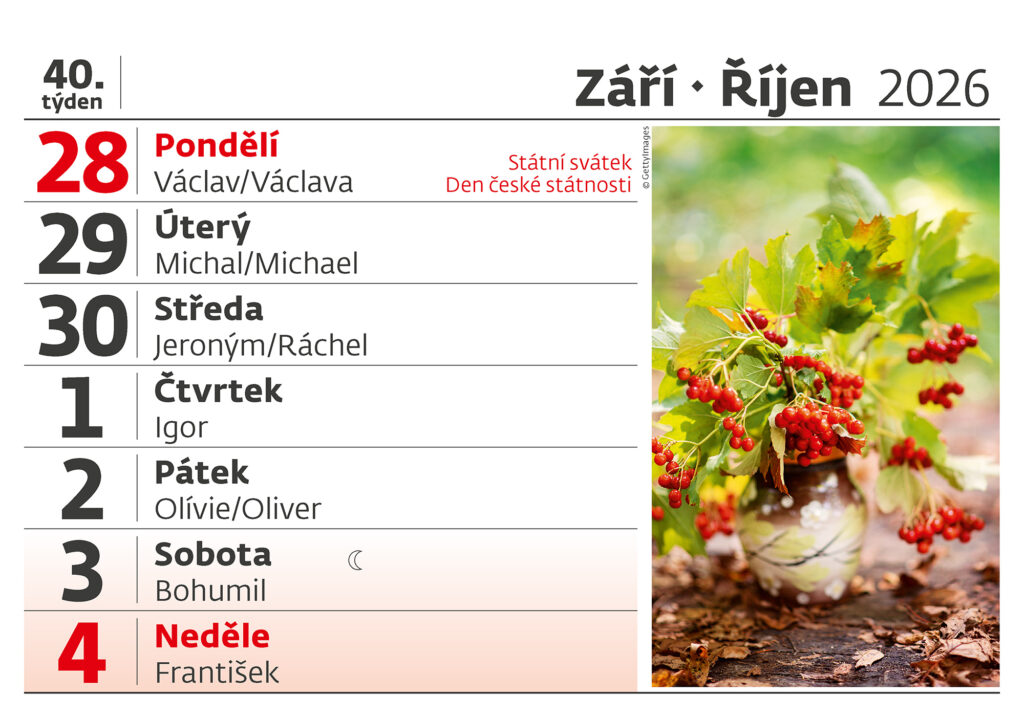 Formát kalendáře: 21,1 x 14,8 cm Kalendárium: české týdenní řádkové Počet stran kalendáře: 54 + 2 Stojánek: s plným dnem Prostor pro přítisk: 21,1 x 3 cm