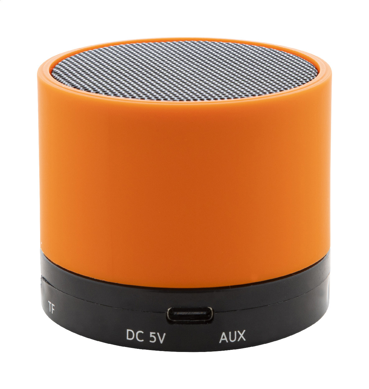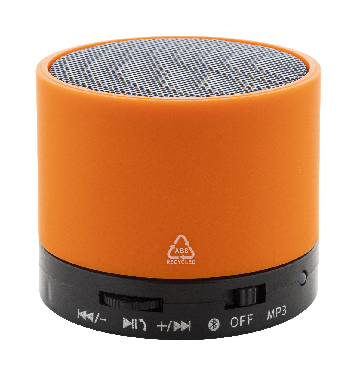 Bezdrátový reproduktor z recyklovaného ABS v pogumovaném pouzdře s kovovou síťovinou a dobíjecí baterií (300 mAh). S funkcí handsfree hovorů a přehrávání MP3 z micro SD karty. Včetně nabíjecího kabelu USB.