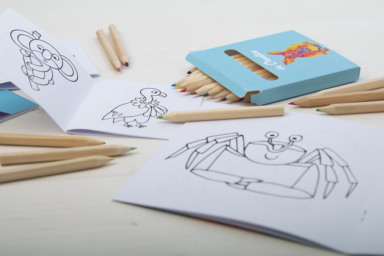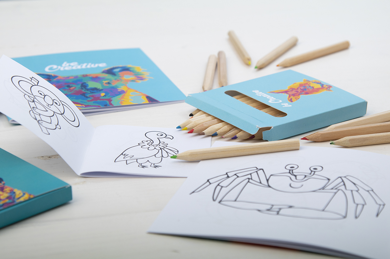 Sada na vybarvení na zakázku v celobarevně potištěné papírové krabičce. Včetně dřevěných pastelek (12 ks) a tématické omalovánky. Cena zahrnuje digitální tisk, nezahrnuje tiskovou přípravu. Min. mn.: 100 ks.