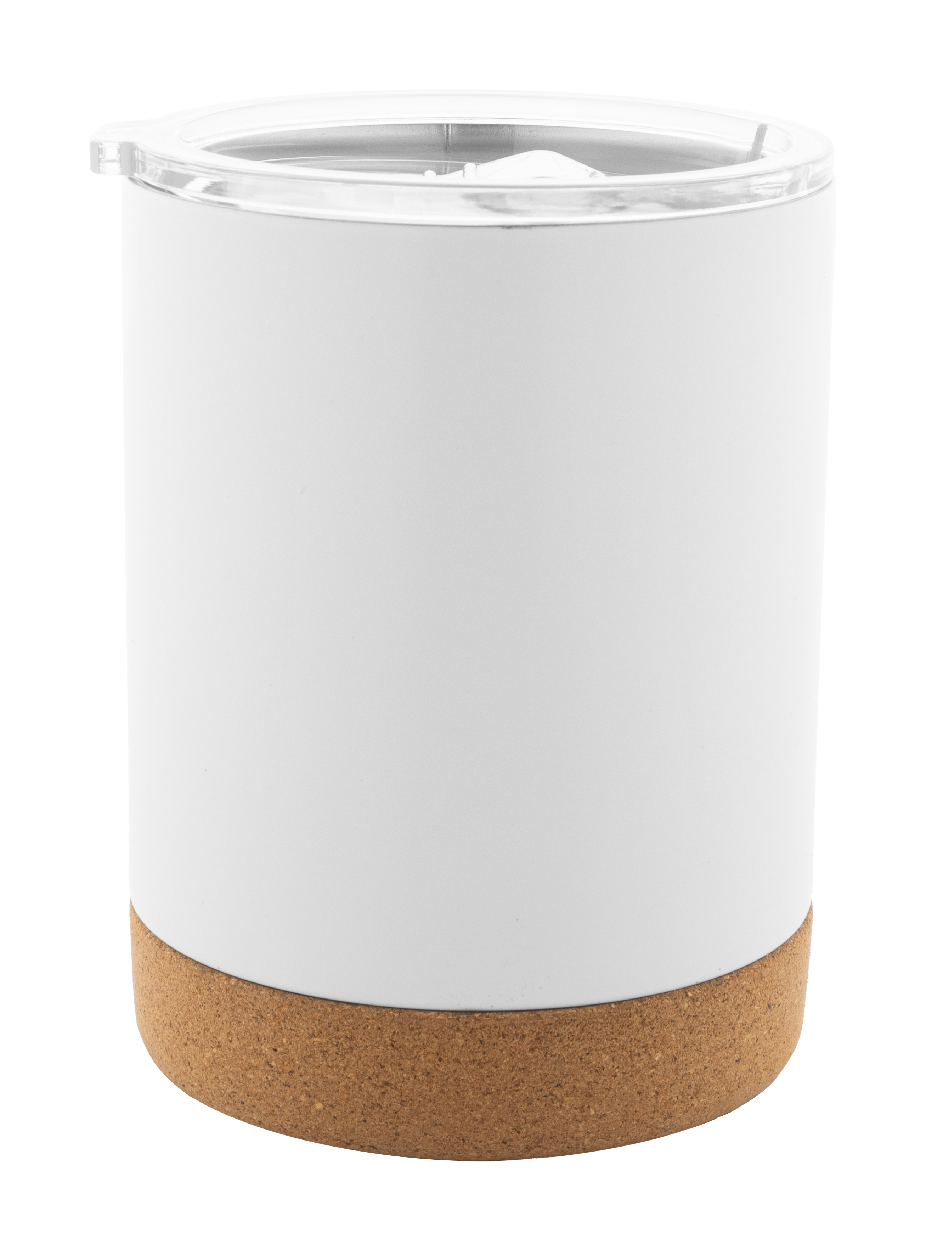 Dvoustěnný nerezový termohrnek s víčkem na pití a dnem z přírodního korku, 330 ml. V kraftové papírové krabici.