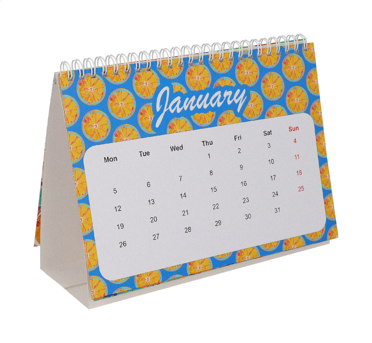 Spirálově vázaný stolní kalendář s barevnou grafikou na zakázku. S 6 oboustrannými měsíčními listy a titulní stranou. Cena zahrnuje digitální tisk na všech stránkách, nezahrnuje tiskovou přípravu. Min. mn.: 100 ks.
