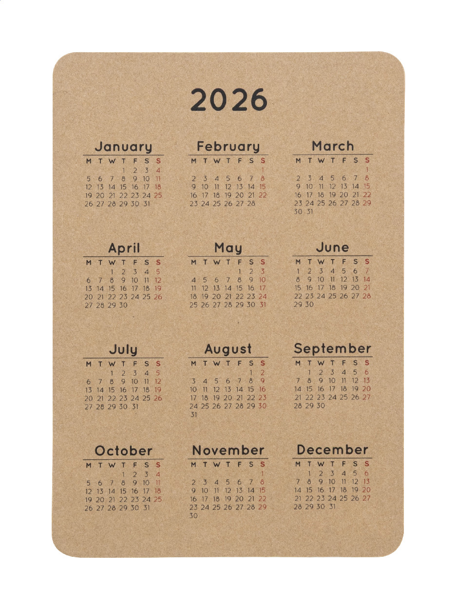 Kapesní kalendář z kraftového papíru (300 g/m²) na zakázku s barevnou grafikou. Cena zahrnuje digitální tisk na obou stranách, nezahrnuje tiskovou přípravu. Min. mn.: 250 ks.