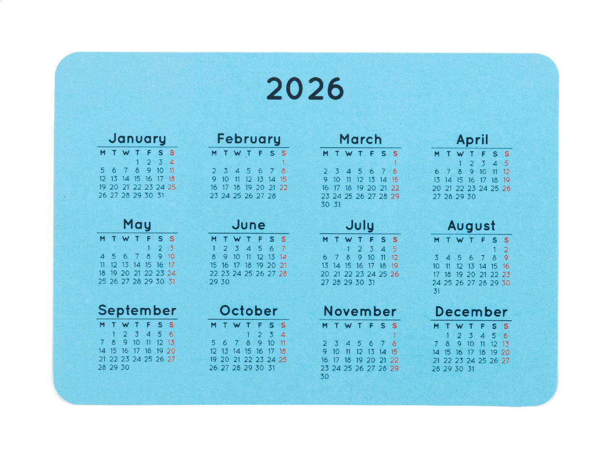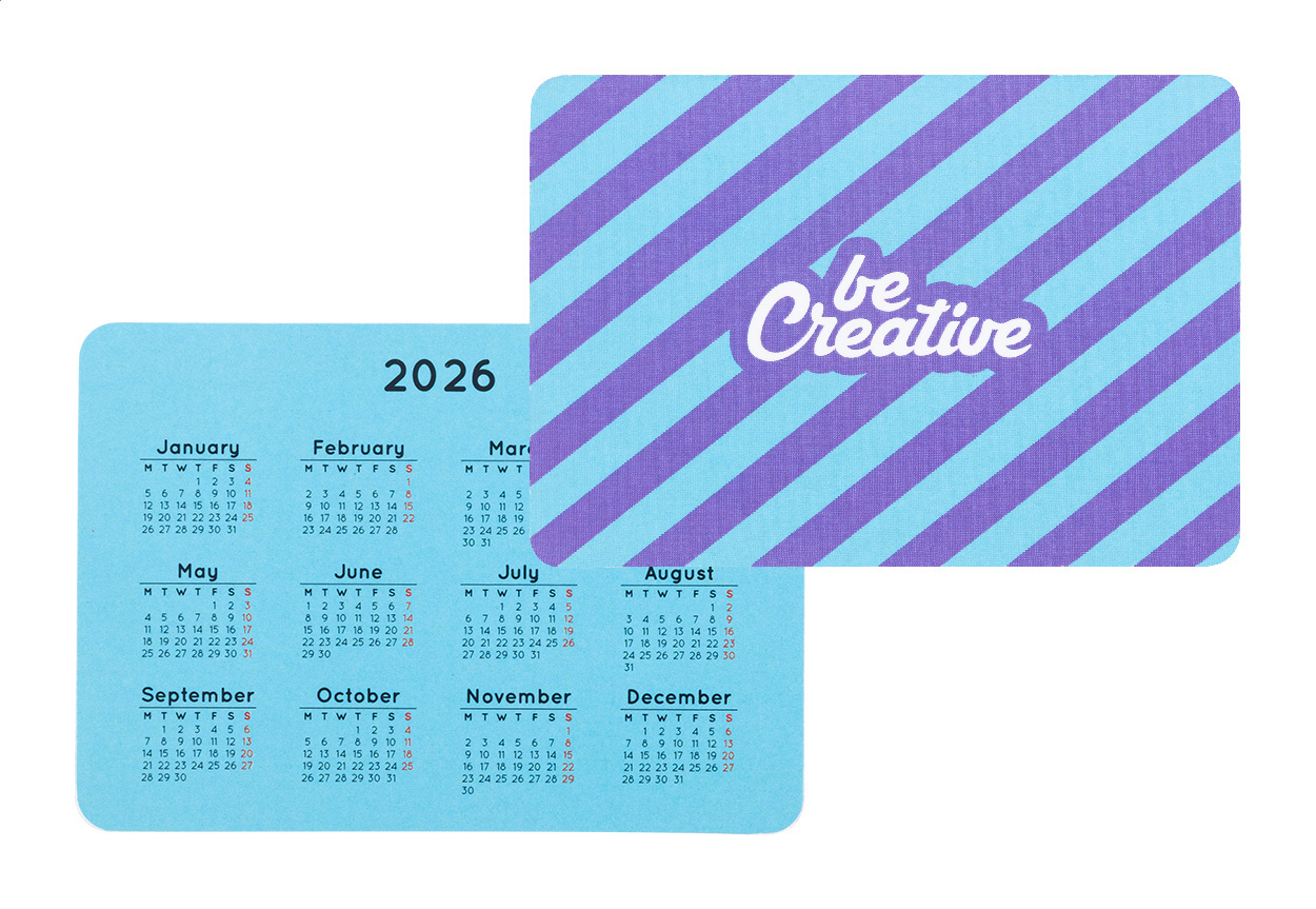Kapesní papírový kalendář (270 g/m²) na zakázku s plnobarevnou grafikou. Cena zahrnuje digitální tisk na obou stranách, nezahrnuje tiskovou přípravu. Min. mn.: 250 ks.