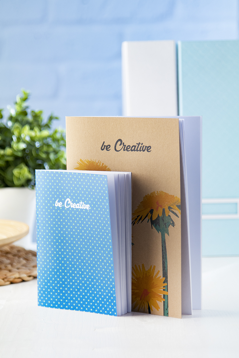 Na zakázku vyrobený blok A6 s deskami z recyklovaného kraftového papíru s 32 listy recyklovaného papíru. Cena zahrnuje celobarevně potištěný vnější obal, nezahrnuje tiskovou přípravu. Min. mn.: 100 ks.