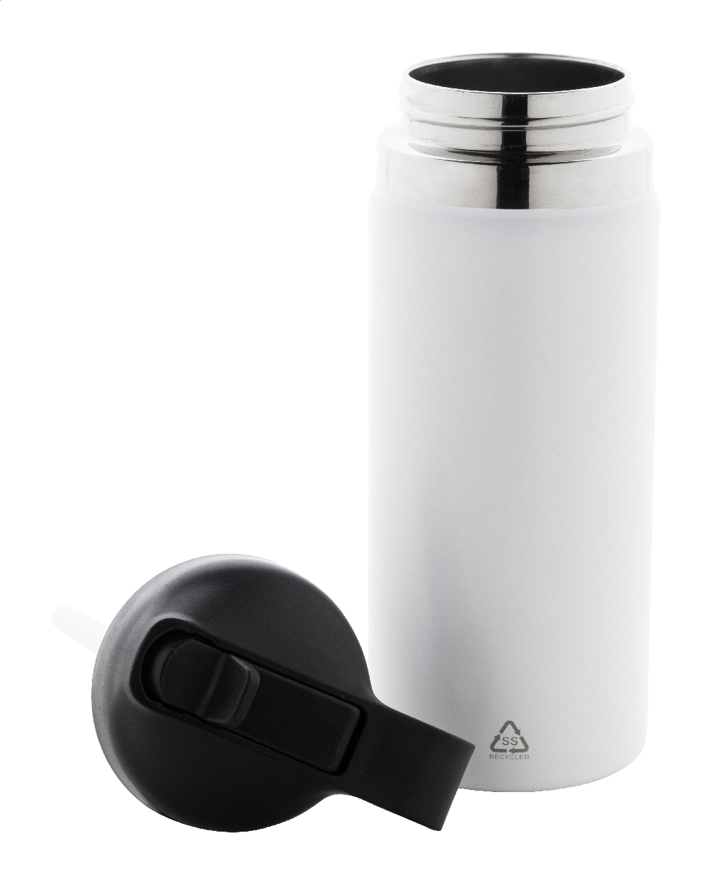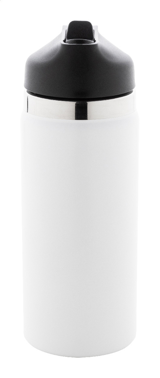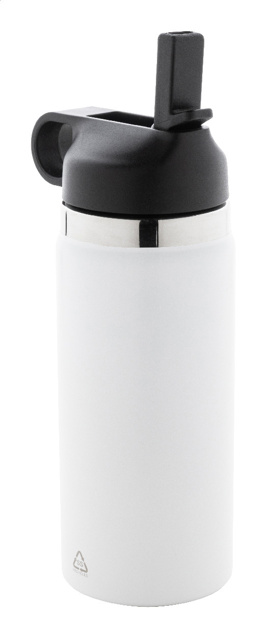Dvoustěnná vakuová láhev z recyklované nerezové oceli s odklápěcím víčkem z PP, rukojetí a integrovaným brčkem. 500 ml.