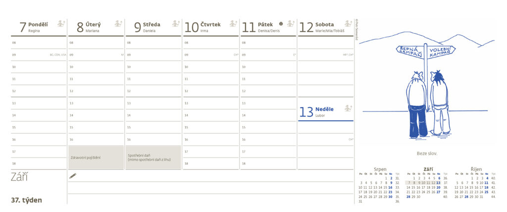 Formát kalendáře: 32,1 x 13,4 cm Kalendárium: české týdenní sloupcové Počet stran kalendáře: 60 + 2 Stojánek: se zámkem Prostor pro přítisk: 32,1 x 3,5 cm + daně,roční období, znamení zvěrokruhu, 3měsíční přehled, EU svátky + s kresbami Petra Semeráda