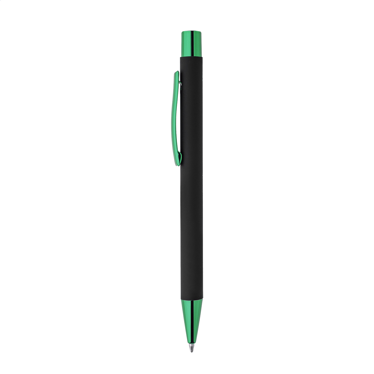 Kuličkové pero z recyklovaného hliníku s černým pogumovaným tělem a barevnými lesklými kovovými částmi. Se speciálním povrchem pro zrcadlové gravírování, které ladí s kovovými částmi. S modrou náplní.