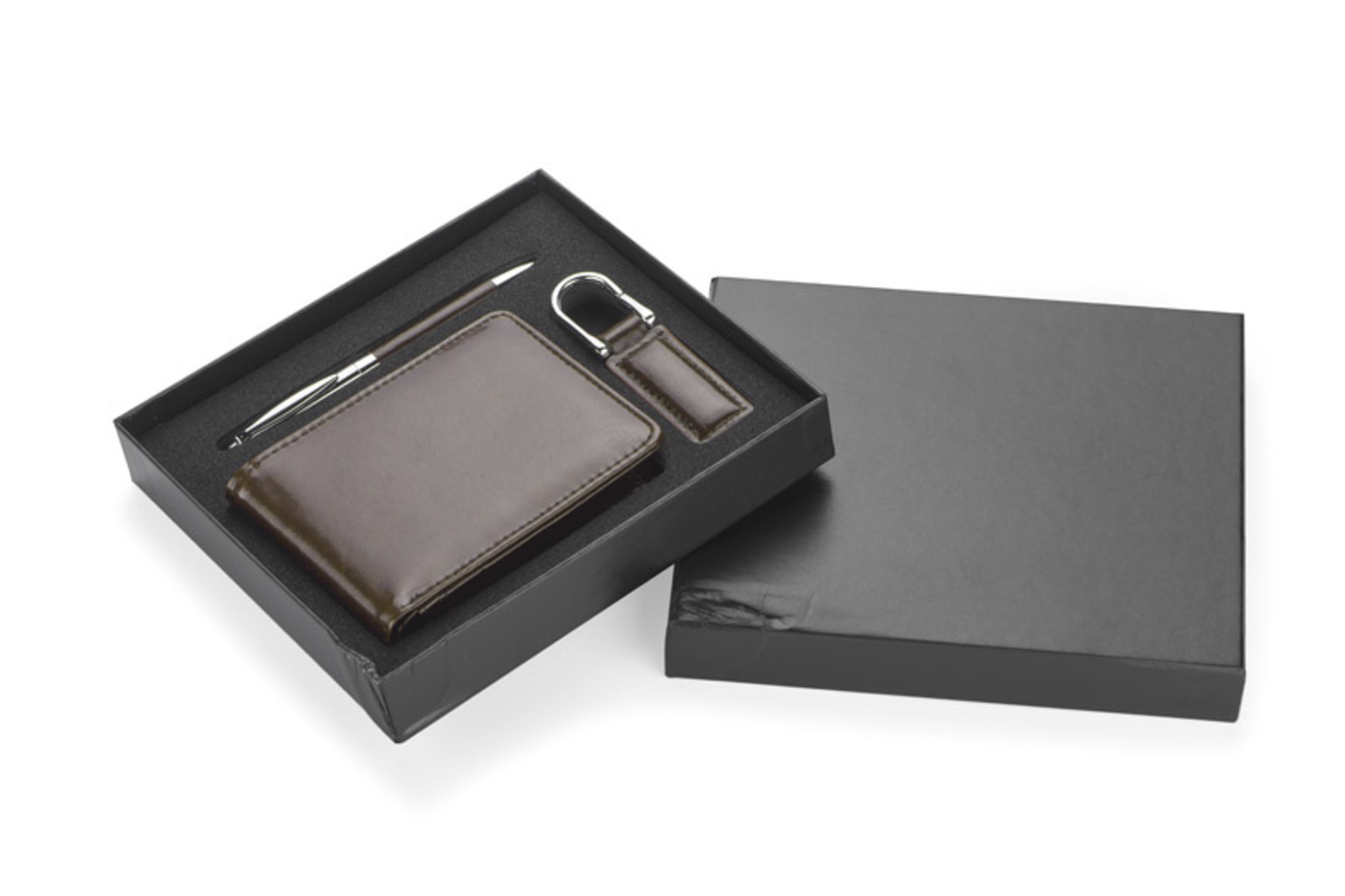 Sada darů se skládá z peněženky, klíčenky a kovového pera. Peněženka je vyrobena z ekologické kůže s 2 kapsami na bankovky, kapsou na mince a dalšími kapsami na například kreditní karty nebo účtenky. Všechny prvky jsou zabaleny v stylové černé krabici. Můžeme také vyryt logo na každý prvek zvlášť stejně jako na krabici. Rozměry produktu: 115 x 91 x 15 mm (peněženka), 133 x ⌀10 mm (pero), 65 x 25 x 5 mm (klíčenka), 181 x 163 x 31 mm (obal).