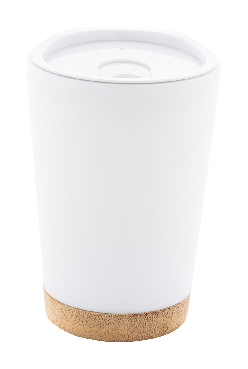Dvoustěnný termo hrnek izolovaný PP plastem s víčkem na pití a bambusovým dnem, 260 ml.