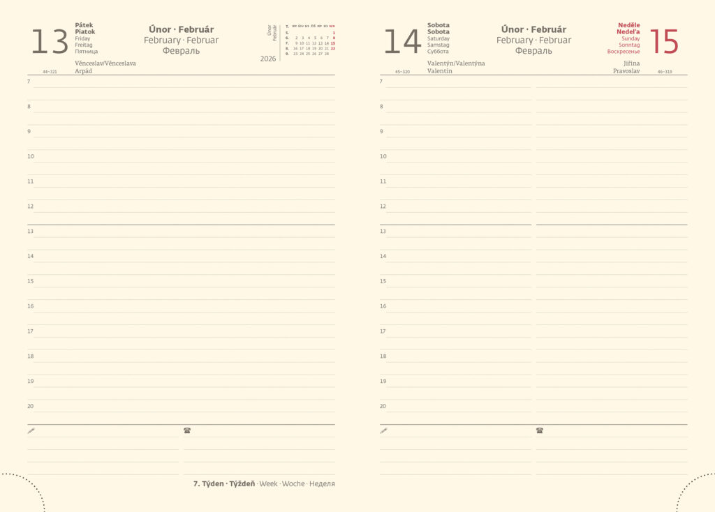 Formát diáře: 145 x 205 mm Rozsah diáře: 352 stran Kalendárium: denní + poutko na tužku + papír bloku chamois