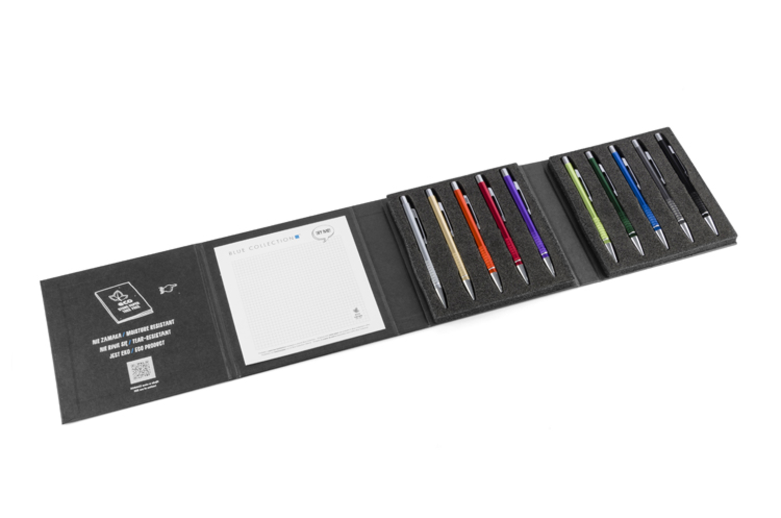 Moderní a stylové pouzdro obsahující 10 nejpopulárnějších kovových per od Blue Collection nabídky. Dobře vyrobené bude imponovat každému, kdo ho drží. Bude to ideální nástroj pro prezentaci, díky uvnitř umístěnému sešitu z kamenného papíru, který umožní vyzkoušet pera.