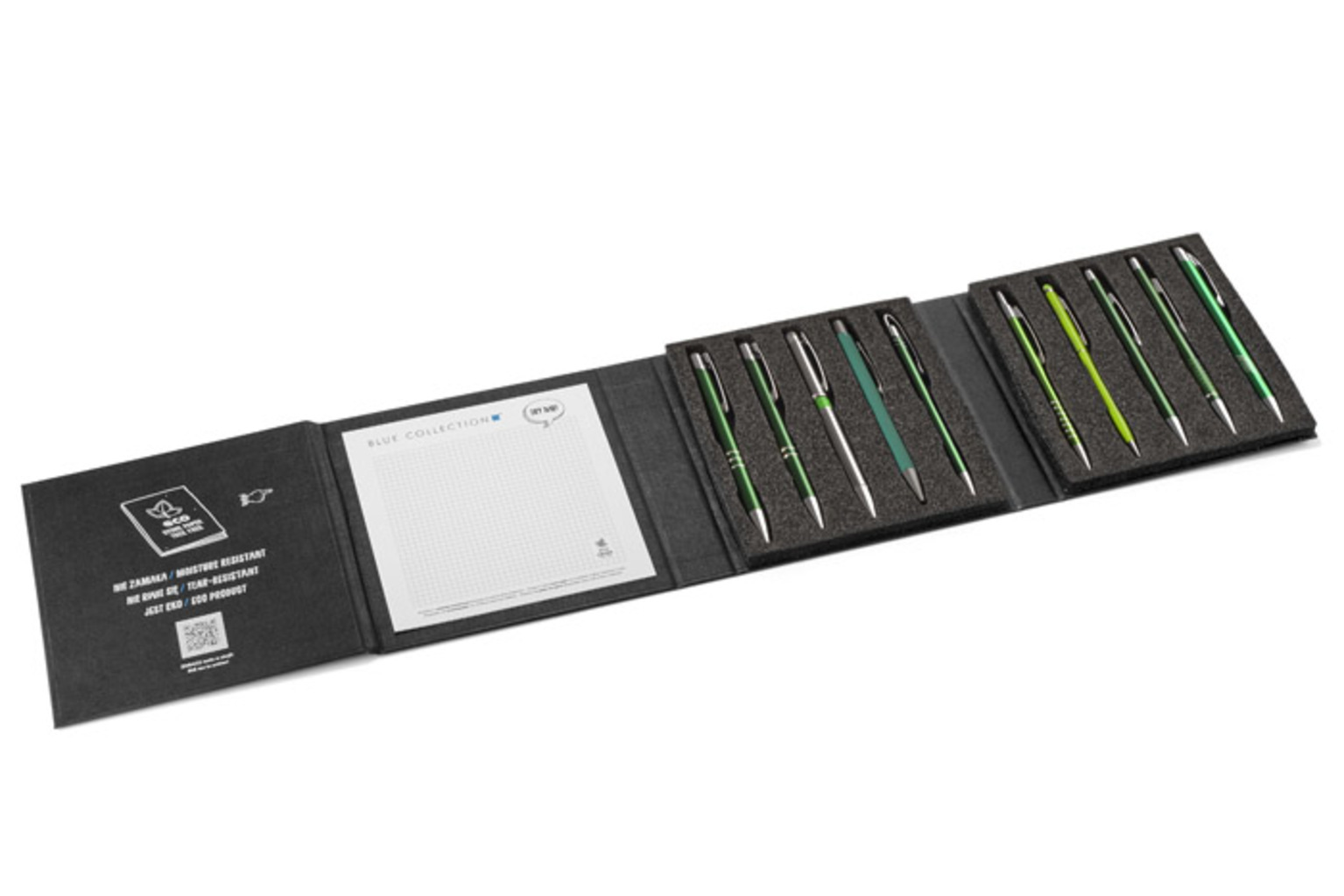 Modern and stylish etui containing 10 most popular metal pens from Blue Collection offer. Well-made will impress everyone, who is holding it. It will be ideal tool for presentation, thanks to inside placed notepad made of stone paper, will give possibility to test pens.