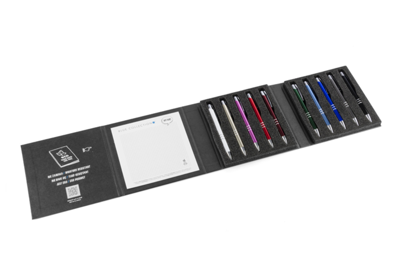 Moderní a stylová kazeta obsahující 10 nejpopulárnějších kovových per od Blue Collection nabídky. Dobře vyrobené bude imponovat každému, kdo ji drží. Bude to ideální nástroj pro prezentaci, díky vloženému notepadu z kamenného papíru, který umožní vyzkoušet pera.
