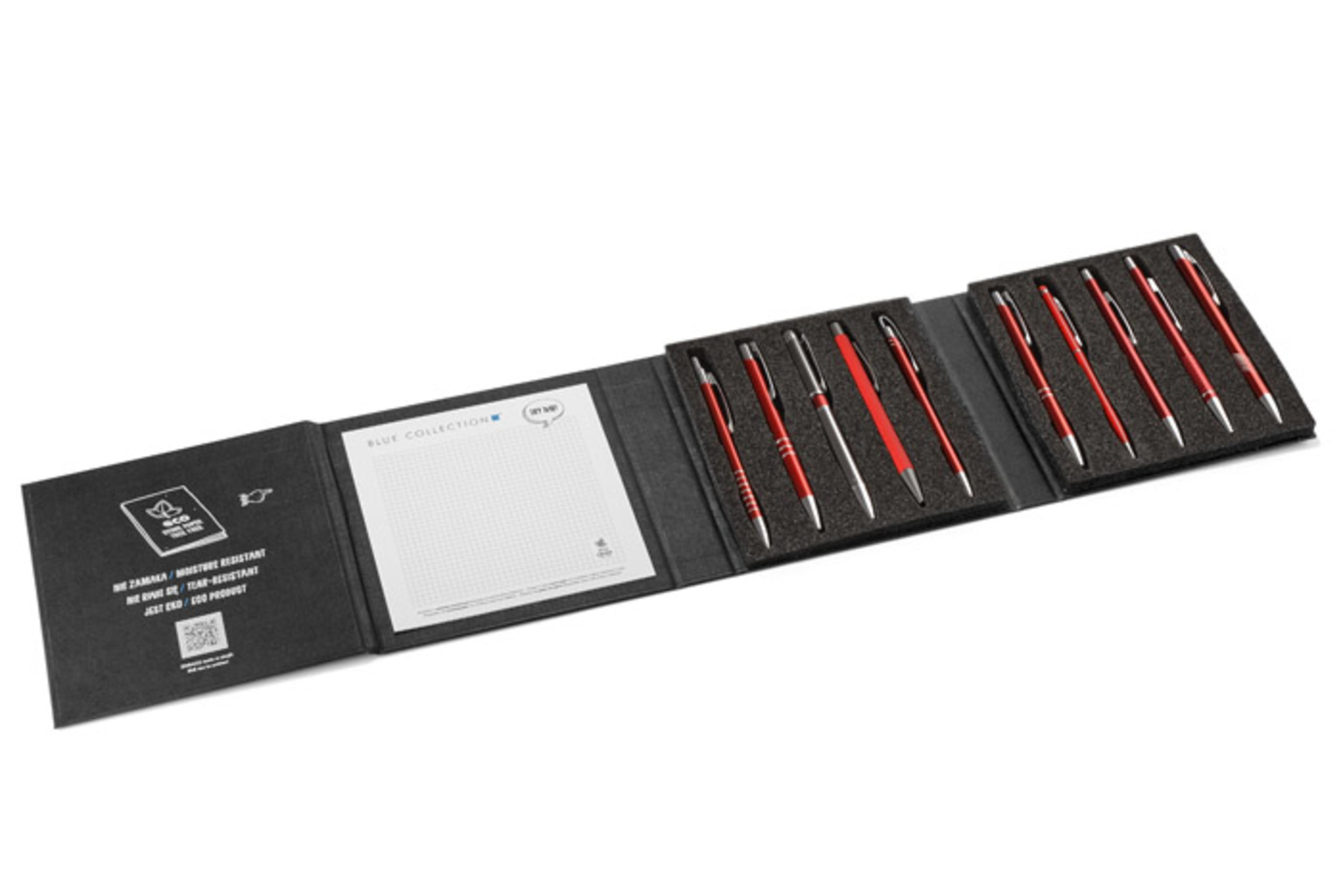 Moderní a stylový obal obsahující 10 nejpopulárnějších kovových per od Blue Collection nabídky. Vysoce kvalitní provedení bude imponovat každému, kdo jej drží. Bude to ideální nástroj pro prezentaci, díky vloženému notýsku z kamenného papíru, který umožní vyzkoušet pera.