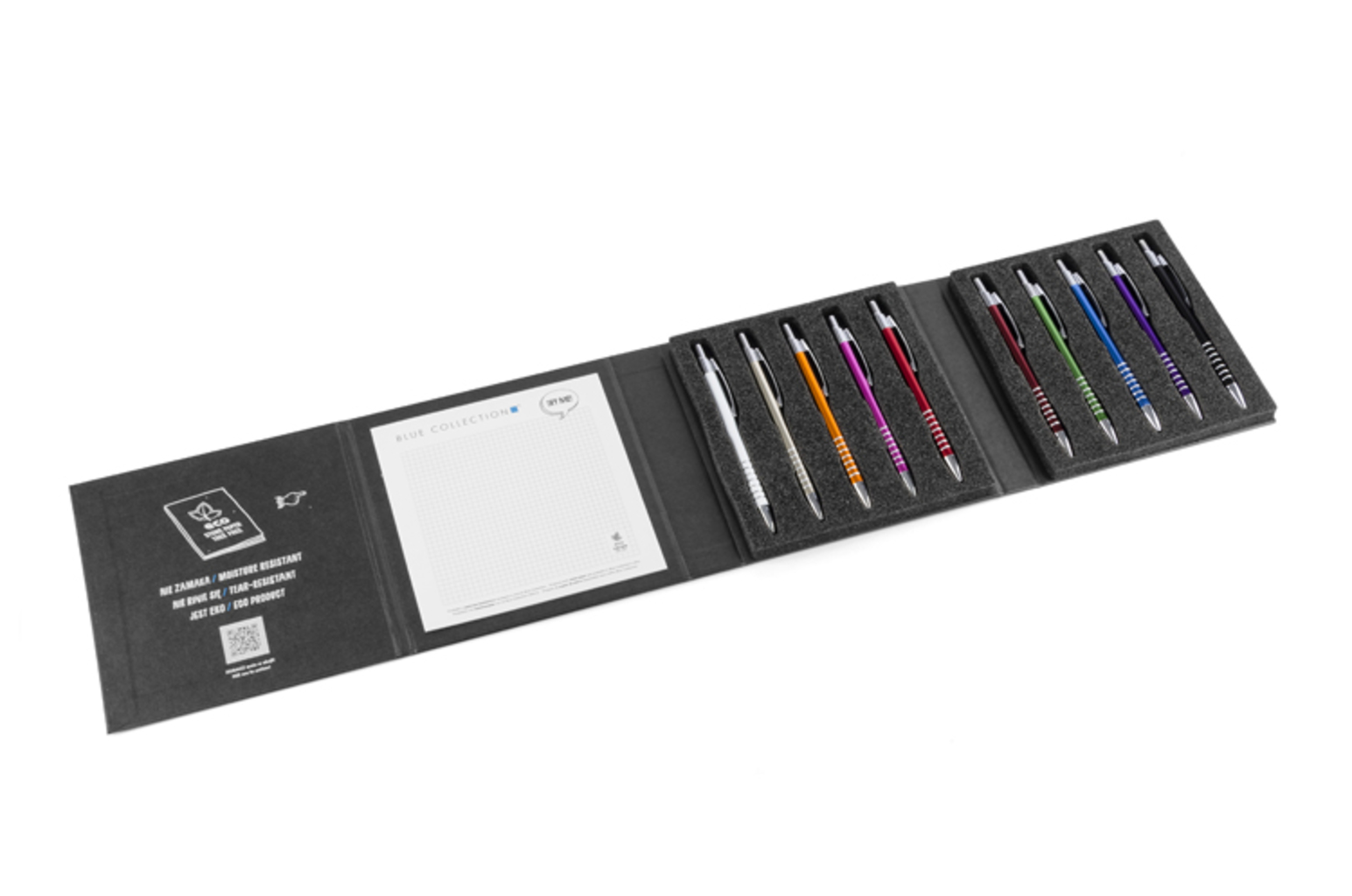 Moderní a stylový pouzdro obsahující 10 nejpopulárnějších kovových per od Blue Collection nabídky. Dobře vyrobené bude imponovat každému, kdo ho drží. Bude to ideální nástroj pro prezentaci, díky vnitřnímu umístěnému notýsku z kamenného papíru, který umožní vyzkoušet pera.