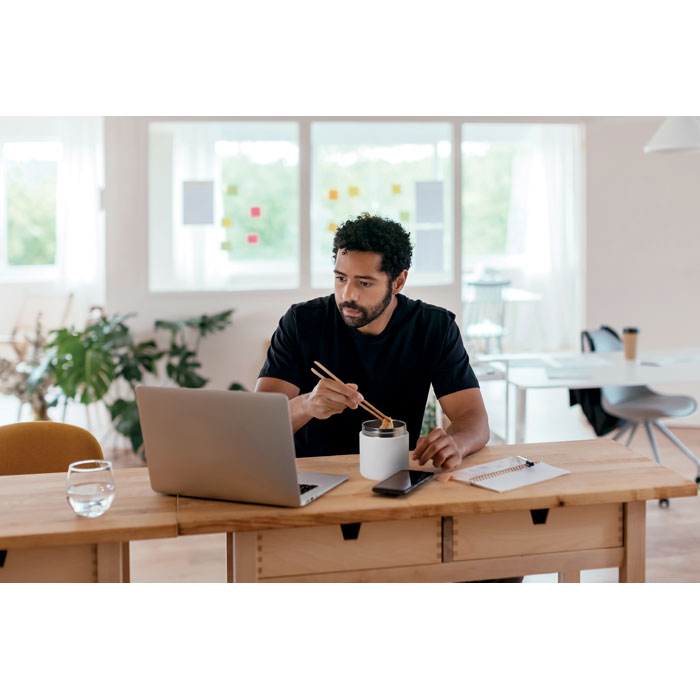 Dvoustěnná izolovaná nádoba na oběd vyrobená z 90 % z recyklované nerezové oceli a z 10 % z nerezové oceli s víčkem z PP. Objem: 500 ml.