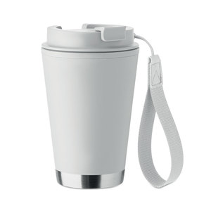 Dvoustěnný pohárek s vnitřní stěnou z PP, vnější stěnou z recyklované nerezové oceli a páskem na zápěstí z RPET. Objem: 300 ml.