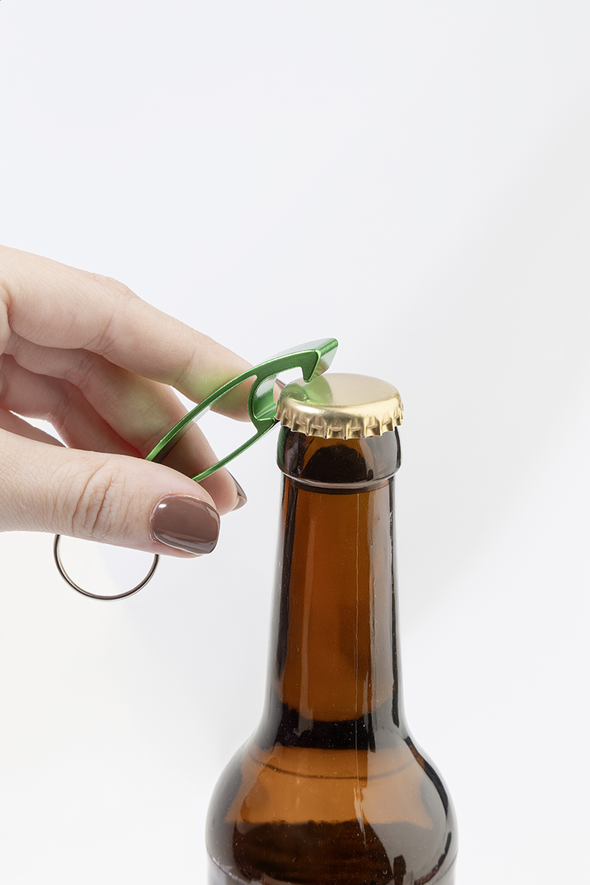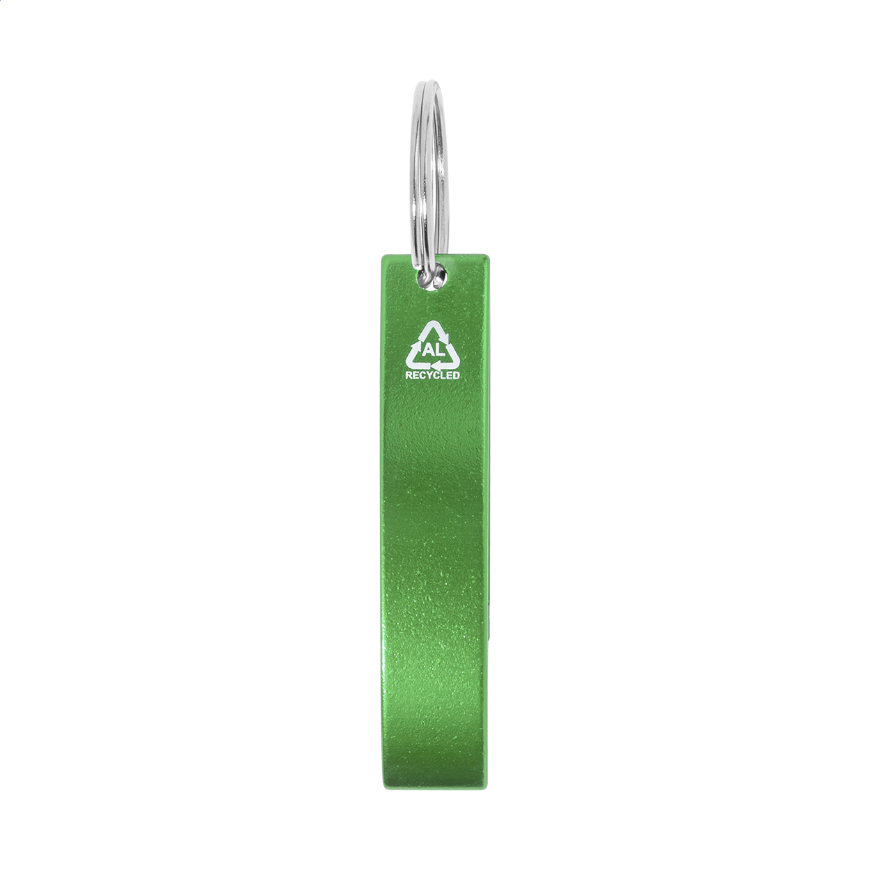 Otvírák na lahve z recyklovaného hliníku s kovovým kroužkem na klíče.
