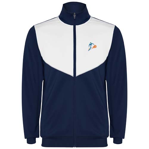 Tepláková souprava z lehké a elastické látky. Bunda s kontrastní barvou a našitými lemy na hrudi. Vysoký límec s kontrastními švy. Středový přední zip. Boční kapsy. 2 × 2 žebrované manžety a pas. Kalhoty s elastickým pasem a stahovací šňůrkou. Kontrastní boční díl s našitým lemem. Lem na zip.
