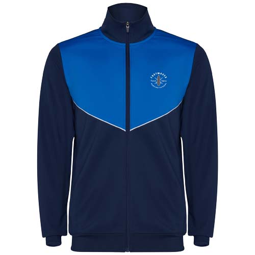 Tepláková souprava z lehké a elastické látky. Bunda s kontrastní barvou a našitými lemy na hrudi. Vysoký límec s kontrastními švy. Středový přední zip. Boční kapsy. 2 × 2 žebrované manžety a pas. Kalhoty s elastickým pasem a stahovací šňůrkou. Kontrastní boční díl s našitým lemem. Lem na zip.