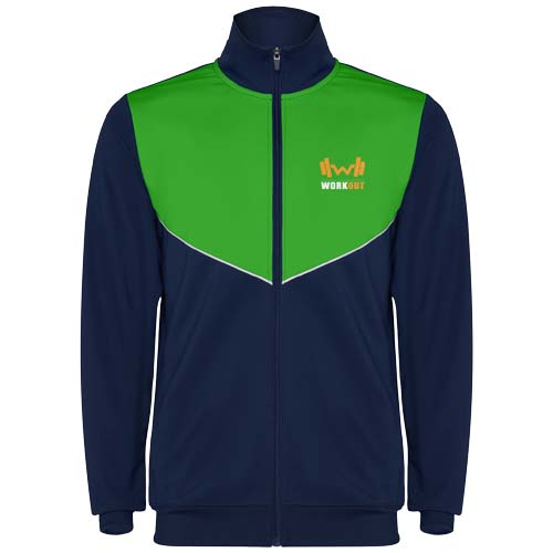 Tepláková souprava z lehké a elastické látky. Bunda s kontrastní barvou a našitými lemy na hrudi. Vysoký límec s kontrastními švy. Středový přední zip. Boční kapsy. 2 × 2 žebrované manžety a pas. Kalhoty s elastickým pasem a stahovací šňůrkou. Kontrastní boční díl s našitým lemem. Lem na zip.