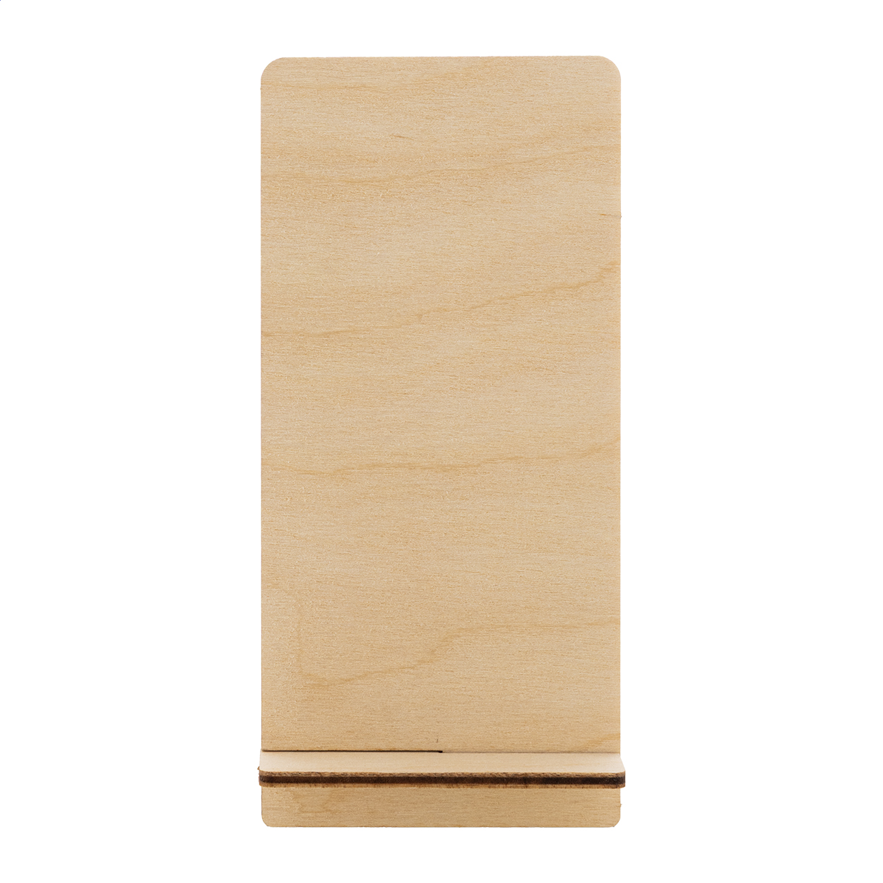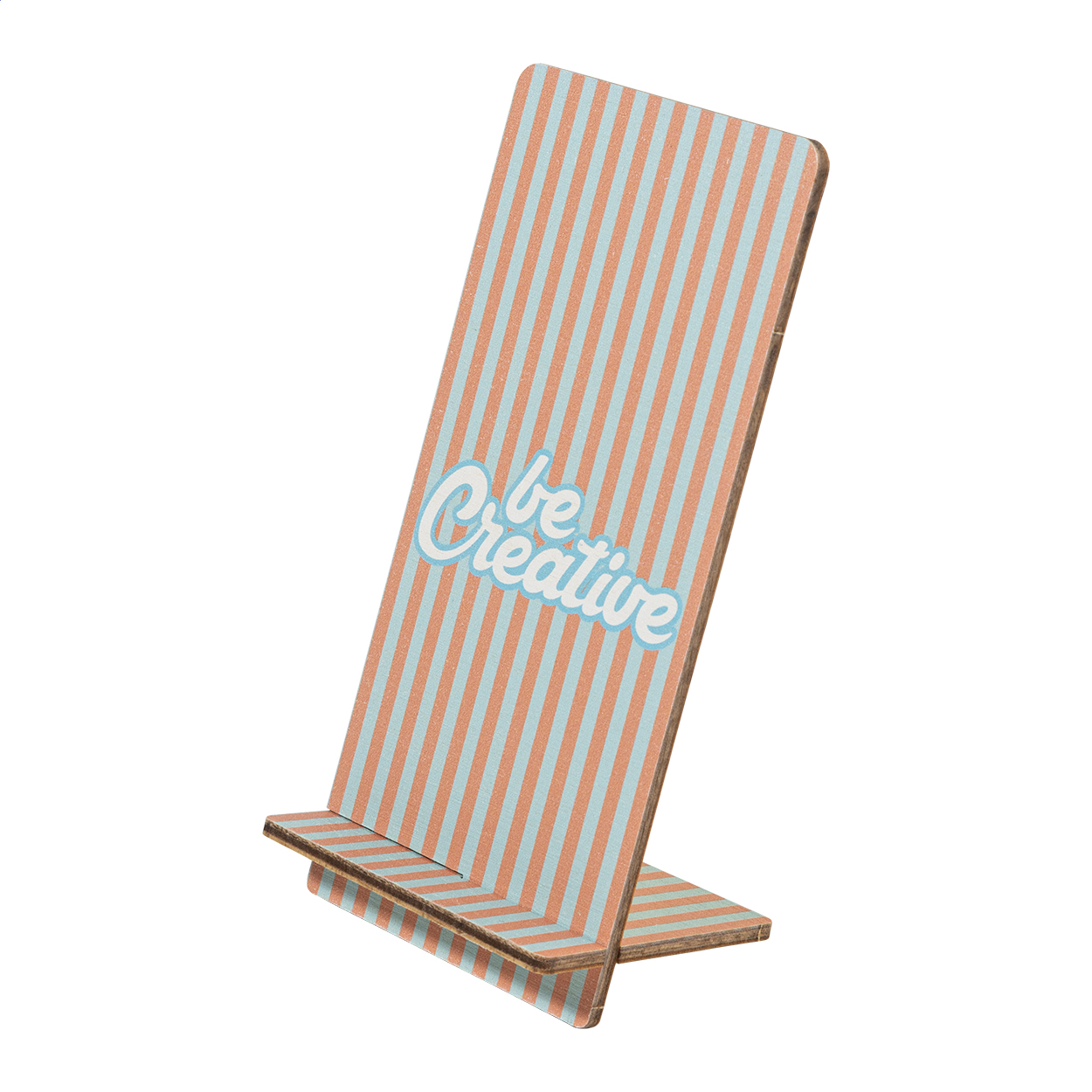 Držák na mobilní telefon na zakázku s barevným potiskem z březové překližky. Cena zahrnuje UV LED potisk na přední straně. Cena nezahrnuje tiskovou přípravu. Dodává se v plochém balení. Min. mn.: 50 ks.