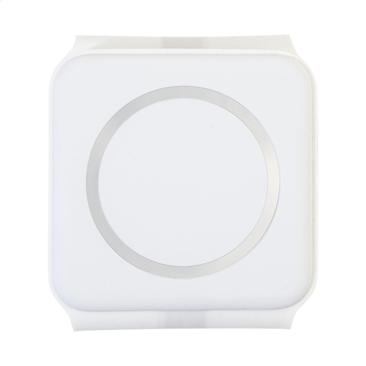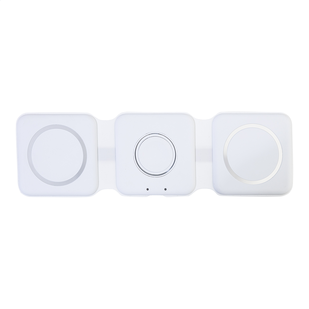 Skládací držák na mobilní telefon a bezdrátová nabíječka z recyklovaného ABS plastu. S magnetickou bezdrátovou rychlonabíječkou (15 W), bezdrátovou nabíječkou (5 W) pro sluchátka a bezdrátovou nabíječkou (2,5 W) pro chytré hodinky (pouze Apple®). Včetně samolepicího kovového kroužku pro telefony bez magnetického povrchu. Včetně USB nabíjecího kabelu.