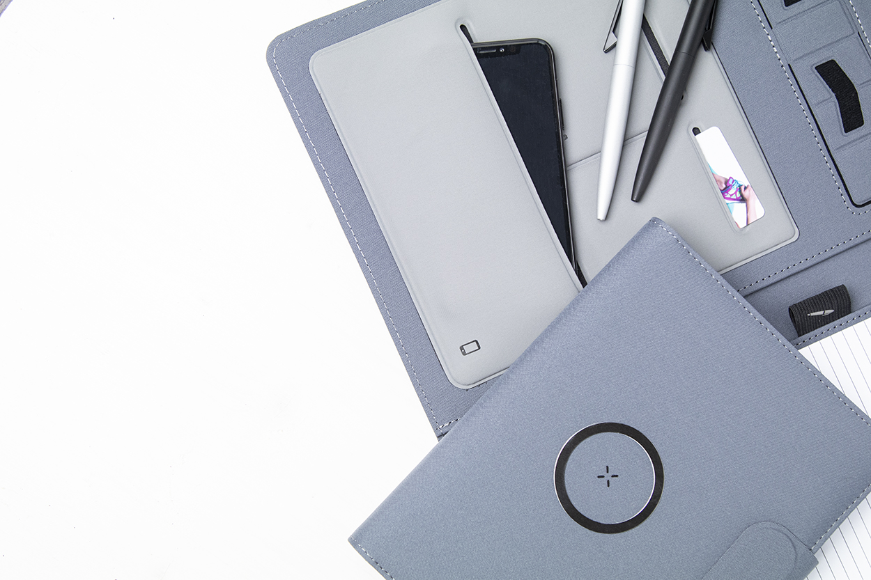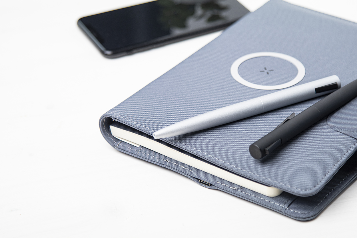 Polyesterová sloha na dokumenty A4 z 300D RPET s vestavěnou magnetickou bezdrátovou rychlonabíječkou (10W), powerbankou 5000 mAh s USB portem pro nabíjení, skládacím držákem na mobil a 20 linkovaným poznámkovým blokem. Včetně samolepícího kovového kroužku pro použití magnetické funkce na jakémkoli bezdrátově nabíjecím zařízení. Včetně USB nabíjecího kabelu.