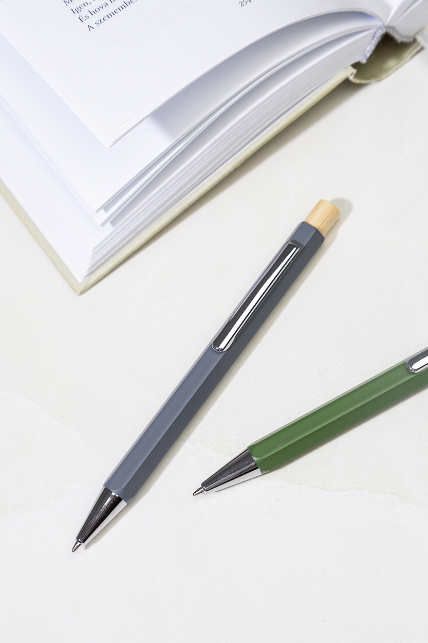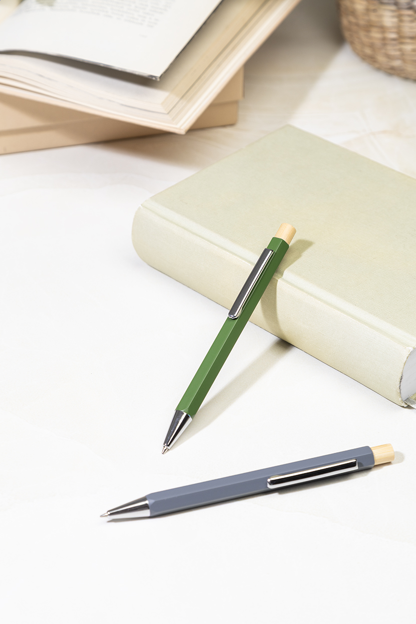 Šestihranné kuličkové pero z recyklovaného hliníku s bambusovým tlačítkem a chromovanými částmi. S modrou náplní.
