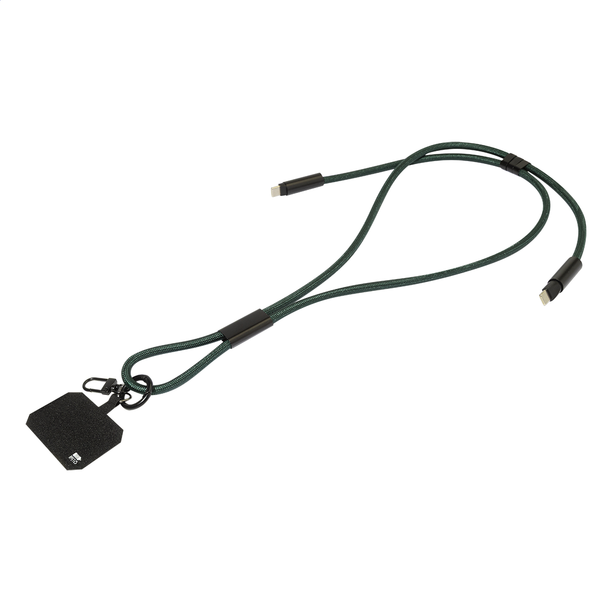 Šňůrka s držákem na mobil z RPET s vložkou pro telefon, karabinou a integrovaným nabíjecím kabelem USB-C na USB-C se skrytými konektory. Podporuje rychlé nabíjení a přenos dat PD 60W.