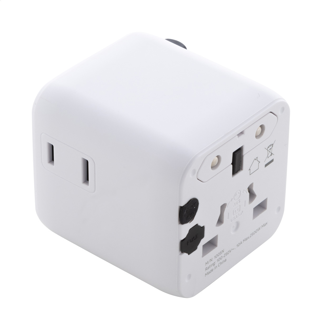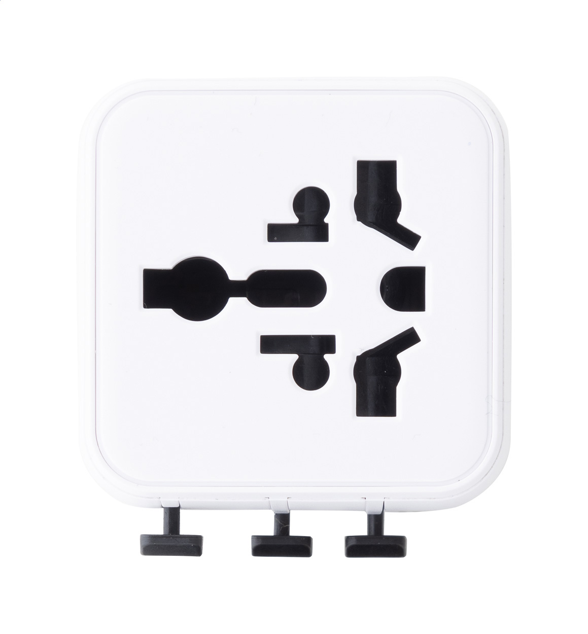 Ultra kompaktní, univerzální celosvětový cestovní adaptér z recyklovaného PC plastu, se zabudovanými zástrčkami pro USA, Evropu, Velkou Británii a Austrálii.
