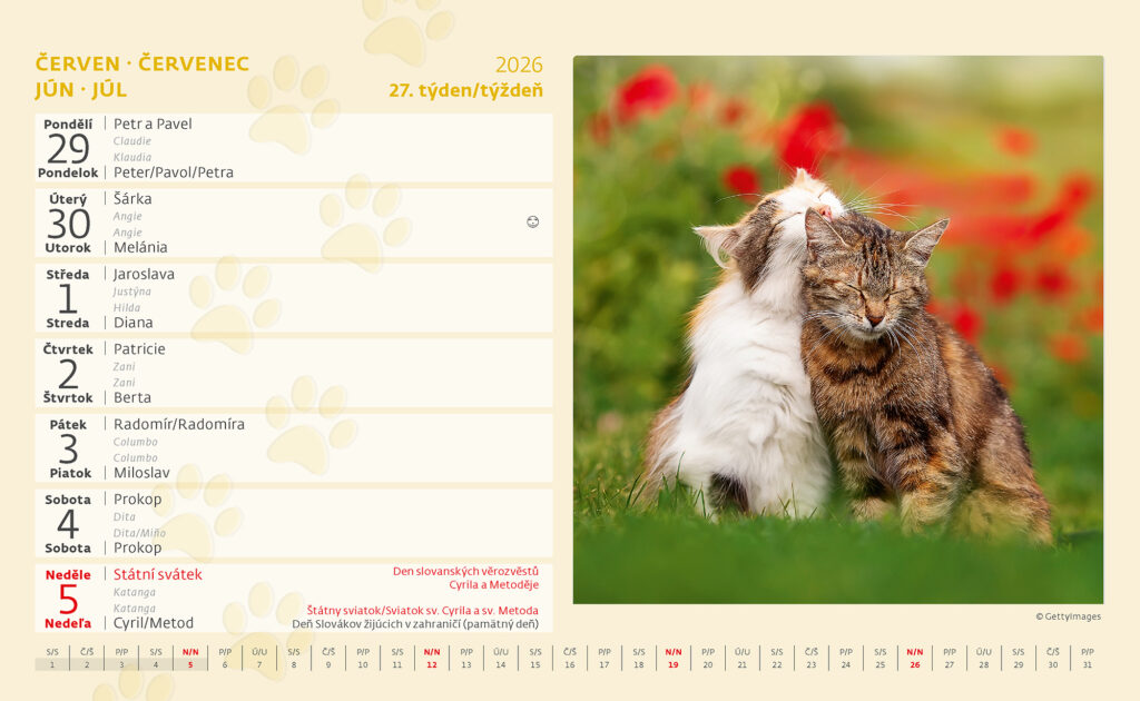 Formát kalendáře: 22,6 x 13,9 cm Kalendárium: české/slovenské týdenní řádkové Počet stran kalendáře: 58 + 2 Stojánek: se zámkem Prostor pro přítisk: 22,6 x 3 cm + 365 kočičích jmen